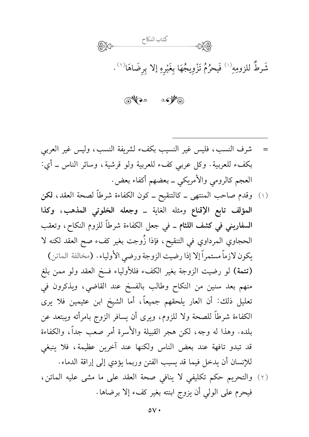 (¬١) وقدم صاحب المنتهى - كالتنقيح - كون الكفاءة شرطاً لصحة العقد، لكن المؤلف تابع الإقناع ومثله الغاية - وجعله الخلوتي المذهب، وكذا السفاريني في كشف اللثام - في جعل الكفاءة شرطاً للزوم النكاح، وتعقب الحجاوي المرداوي في التنقيح، فإذا زُوجت بغير كفء صح العقد لكنه لا يكون لازماً مستمراً إلا إذا رضيت الزوجة ورضي الأولياء. (مخالفة الماتن)