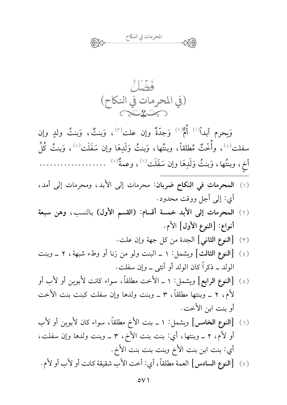 (¬٢) المحرمات إلى الأبد خمسة أقسام: (القسم الأول) بالنسب، وهن سبعة أنواع: [النوع الأول] الأم.