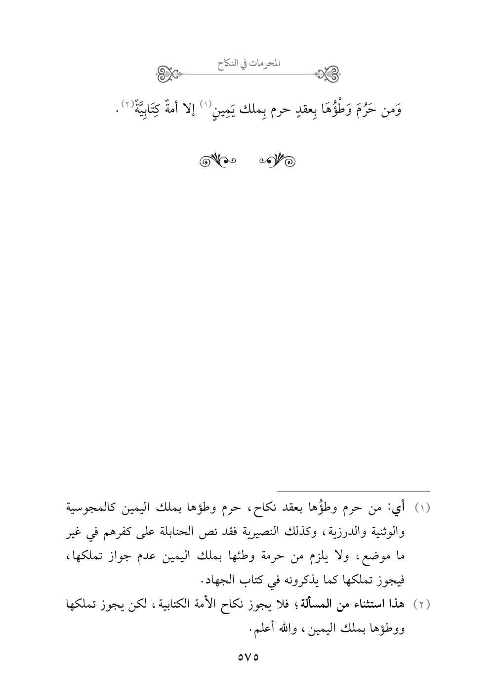 (¬١) أي: من حرم وطؤُها بعقد نكاح، حرم وطؤها بملك اليمين كالمجوسية والوثنية والدرزية، وكذلك النصيرية فقد نص الحنابلة على كفرهم في غير ما موضع، ولا يلزم من حرمة وطئها بملك اليمين عدم جواز تملكها، فيجوز تملكها كما يذكرونه في كتاب الجهاد.