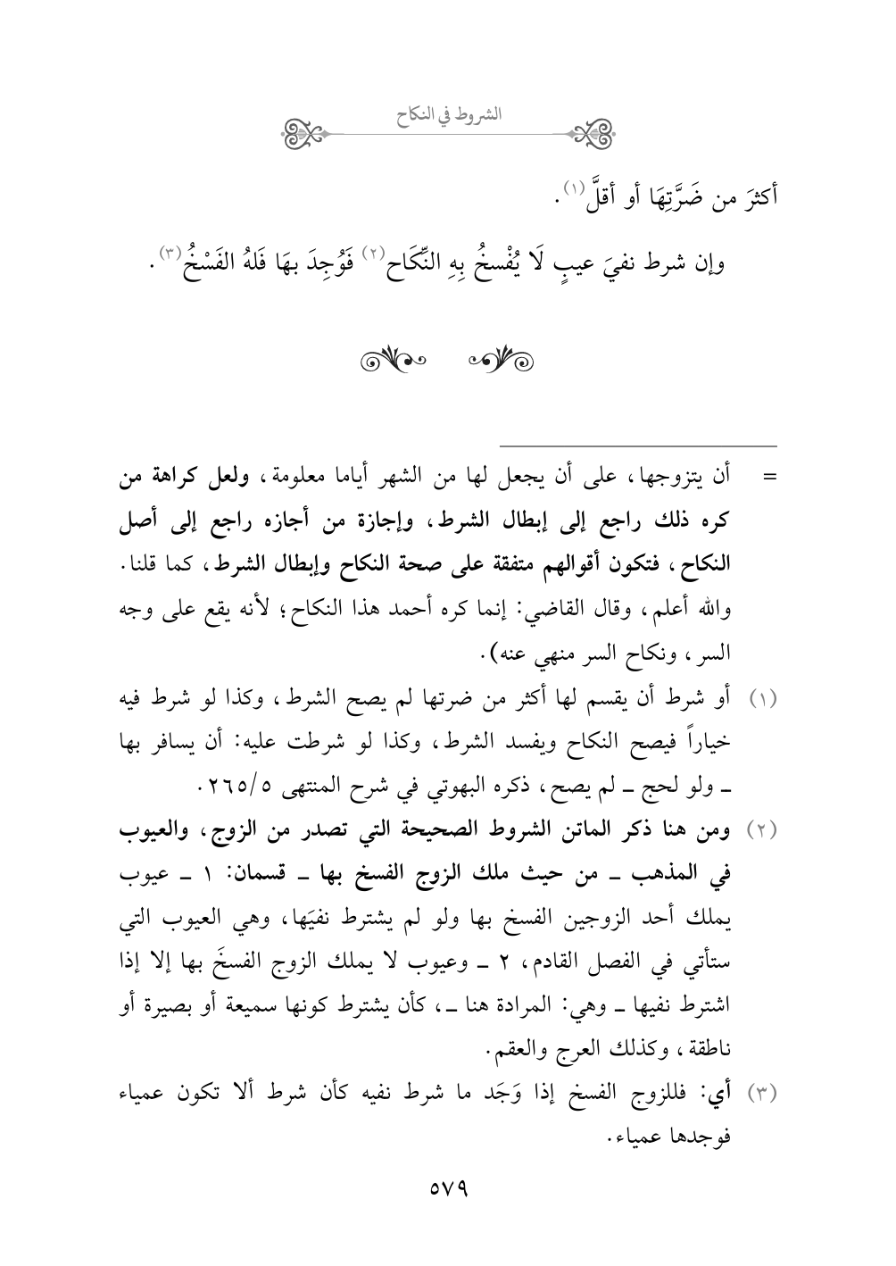 (¬٢) ومن هنا ذكر الماتن الشروط الصحيحة التي تصدر من الزوج، والعيوب في المذهب - من حيث ملك الزوج الفسخ بها - قسمان: ١ - عيوب يملك أحد الزوجين الفسخ بها ولو لم يشترط نفيَها، وهي العيوب التي ستأتي في الفصل القادم، ٢ - وعيوب لا يملك الزوج الفسخَ بها إلا إذا اشترط نفيها - وهي: المرادة هنا -، كأن يشترط كونها سميعة أو بصيرة أو ناطقة، وكذلك العرج والعقم.