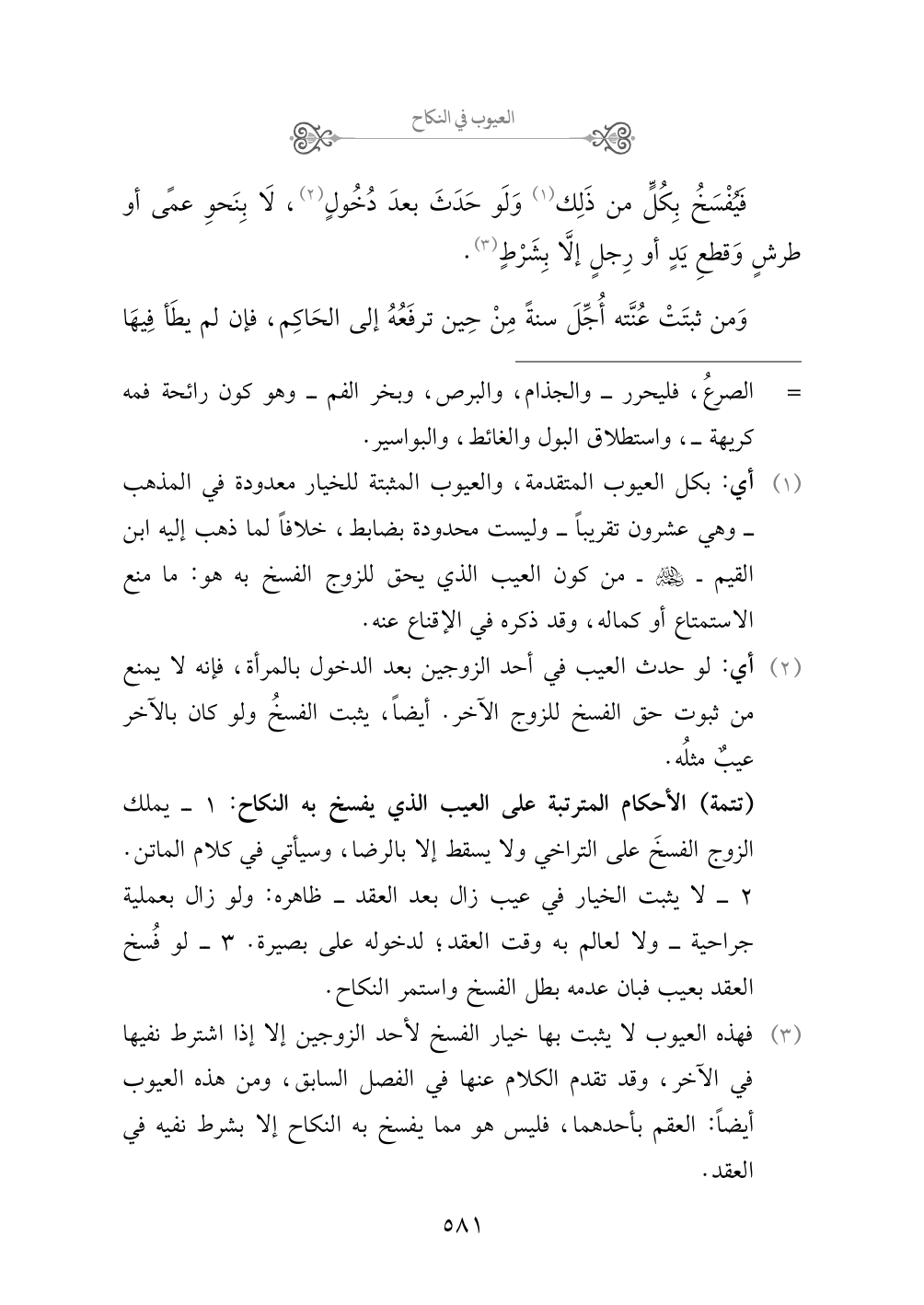 (¬٣) فهذه العيوب لا يثبت بها خيار الفسخ لأحد الزوجين إلا إذا اشترط نفيها في الآخر، وقد تقدم الكلام عنها في الفصل السابق، ومن هذه العيوب أيضاً: العقم بأحدهما، فليس هو مما يفسخ به النكاح إلا بشرط نفيه في العقد.