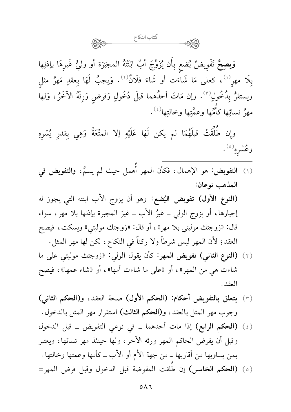 (¬١) التفويض: هو الإهمال، فكأن المهر أُهمل حيث لم يسمَّ، والتفويض في المذهب نوعان: