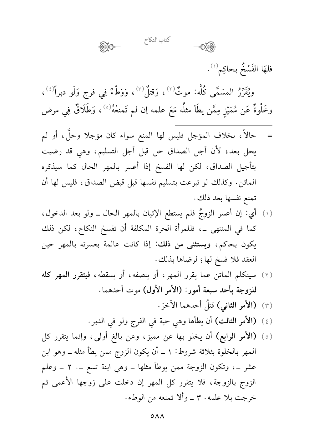 (¬٥) (الأمر الرابع) أن يخلو بها عن مميز، وعن بالغ أولى، وإنما يتقرر كل المهر بالخلوة بثلاثة شروط: ١ - أن يكون الزوج ممن يطأ مثله - وهو ابن عشر -، وتكون الزوجة ممن يوطأ مثلها - وهي ابنة تسع -. ٢ - وعلم الزوج بالزوجة، فلا يتقرر كل المهر إن دخلت على زوجها الأعمى ثم خرجت بلا علمه. ٣ - وألا تمنعه من الوطء.