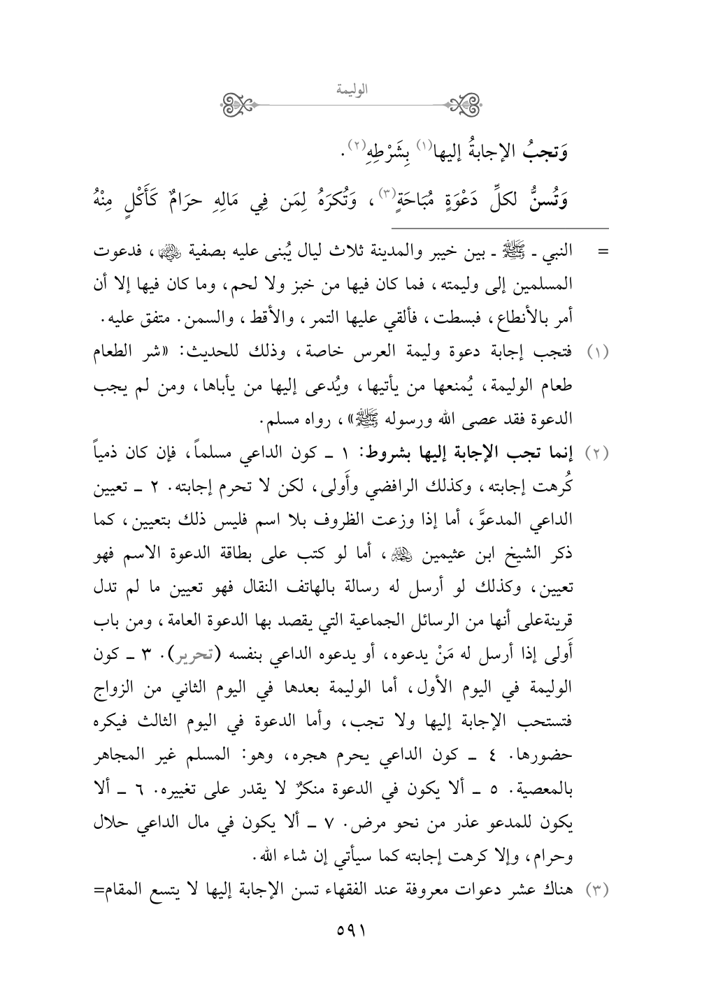 (¬٢) إنما تجب الإجابة إليها بشروط: ١ - كون الداعي مسلماً، فإن كان ذمياً كُرهت إجابته، وكذلك الرافضي وأَولى، لكن لا تحرم إجابته. ٢ - تعيين الداعي المدعوَّ، أما إذا وزعت الظروف بلا اسم فليس ذلك بتعيين، كما ذكر الشيخ ابن عثيمين رحمه الله، أما لو كتب على بطاقة الدعوة الاسم فهو تعيين، وكذلك لو أرسل له رسالة بالهاتف النقال فهو تعيين ما لم تدل قرينةعلى أنها من الرسائل الجماعية التي يقصد بها الدعوة العامة، ومن باب أَولى إذا أرسل له مَنْ يدعوه، أو يدعوه الداعي بنفسه (تحرير). ٣ - كون الوليمة في اليوم الأول، أما الوليمة بعدها في اليوم الثاني من الزواج فتستحب الإجابة إليها ولا تجب، وأما الدعوة في اليوم الثالث فيكره حضورها. ٤ - كون الداعي يحرم هجره، وهو: المسلم غير المجاهر بالمعصية. ٥ - ألا يكون في الدعوة منكرٌ لا يقدر على تغييره. ٦ - ألا يكون للمدعو عذر من نحو مرض. ٧ - ألا يكون في مال الداعي حلال وحرام، وإلا كرهت إجابته كما سيأتي إن شاء الله.