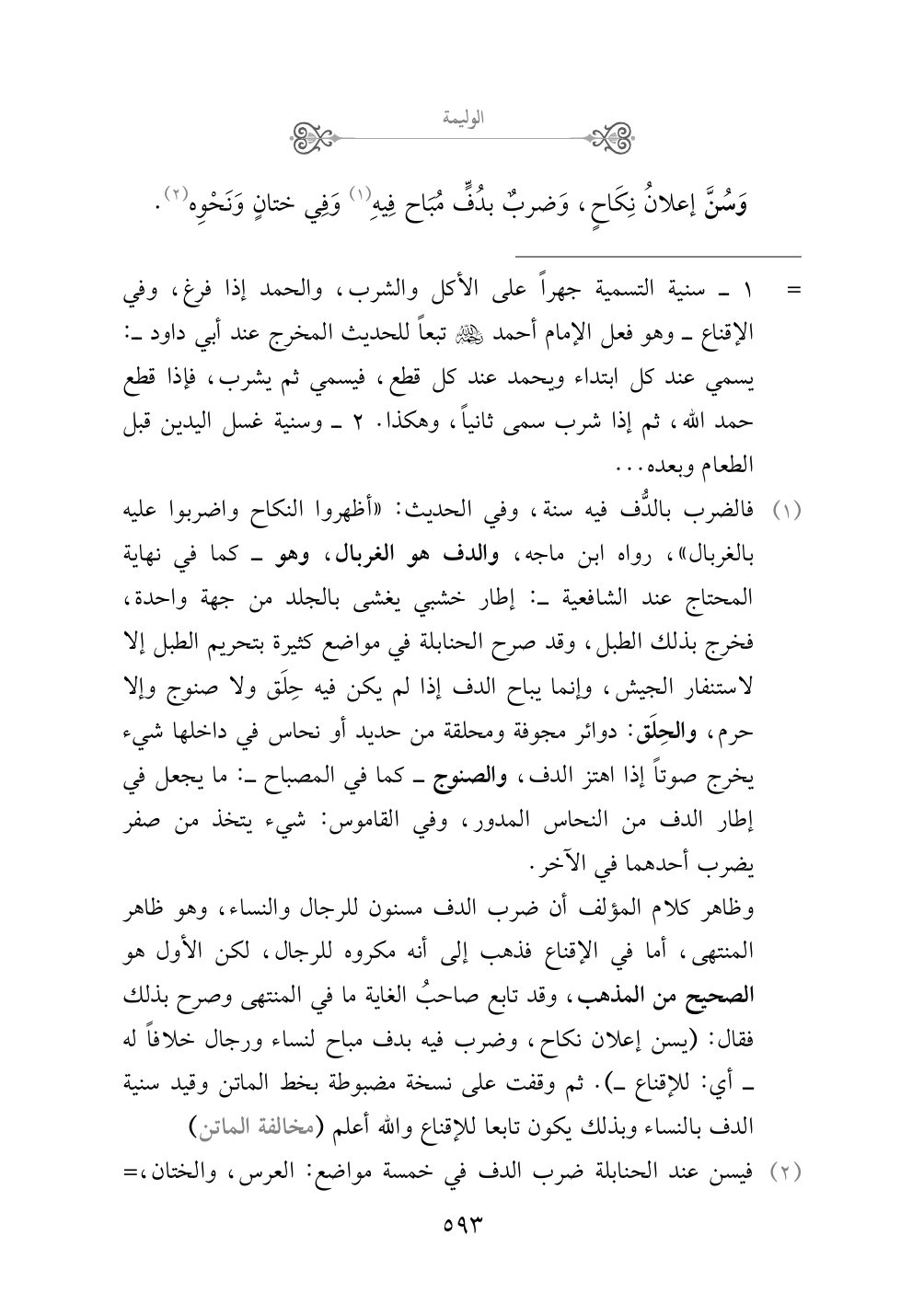 (¬١) فالضرب بالدُّف فيه سنة، وفي الحديث: «أظهروا النكاح واضربوا عليه بالغربال»، رواه ابن ماجه، والدف هو الغربال، وهو - كما في نهاية المحتاج عند الشافعية -: إطار خشبي يغشى بالجلد من جهة واحدة، فخرج بذلك الطبل، وقد صرح الحنابلة في مواضع كثيرة بتحريم الطبل إلا لاستنفار الجيش، وإنما يباح الدف إذا لم يكن فيه حِلَق ولا صنوج وإلا حرم، والحِلَق: دوائر مجوفة ومحلقة من حديد أو نحاس في داخلها شيء يخرج صوتاً إذا اهتز الدف، والصنوج - كما في المصباح -: ما يجعل في إطار الدف من النحاس المدور، وفي القاموس: (شيء يتخذ من صفر يضرب أحدهما في الآخر).