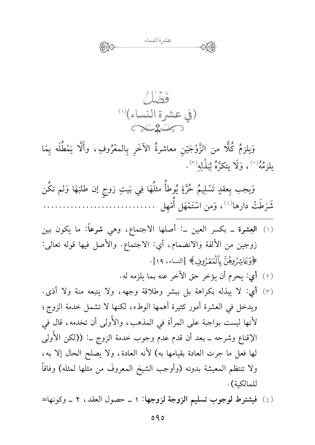 (¬١) العِشرة - بكسر العين -: أصلها الاجتماع، وهي شرعاً: ما يكون بين زوجين من الألفة والانضمام، أي: الاجتماع. والأصل فيها قوله تعالى: {وعاشروهن بالمعروف} [النساء، ١٩].