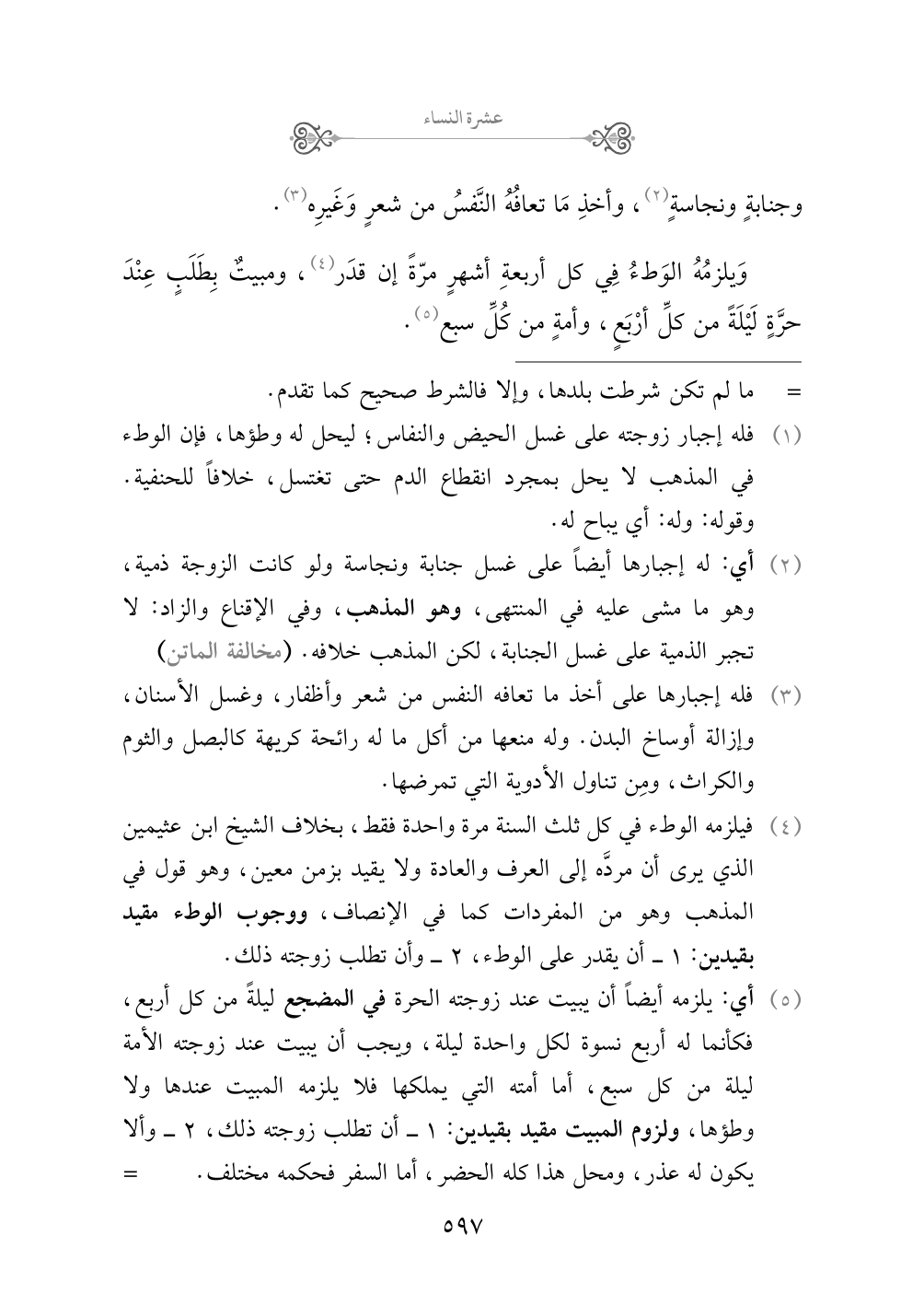 (¬٤) فيلزمه الوطء في كل ثلث السنة مرة واحدة فقط، بخلاف الشيخ ابن عثيمين الذي يرى أن مردَّه إلى العرف والعادة ولا يقيد بزمن معين، وهو قول في المذهب، وهو من المفردات كما في الإنصاف، ووجوب الوطء مقيد بقيدين: ١ - أن يقدر على الوطء، ٢ - وأن تطلب زوجته ذلك.
