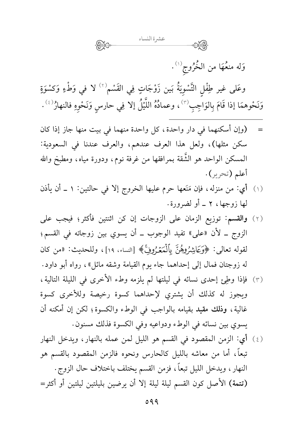 (¬٣) فإذا وطِئ إحدى نسائه في ليلتها لم يلزمه وطء الأخرى في الليلة التالية، ويجوز له كذلك أن يشتري لإحداهما كسوة رخيصة وللأخرى كسوة غالية، وذلك مقيد بقيامه بالواجب في الوطء والكسوة؛ لكن إن أمكنه أن يسوي بين نسائه في الوطء ودواعيه وفي الكسوة فذلك مسنون.