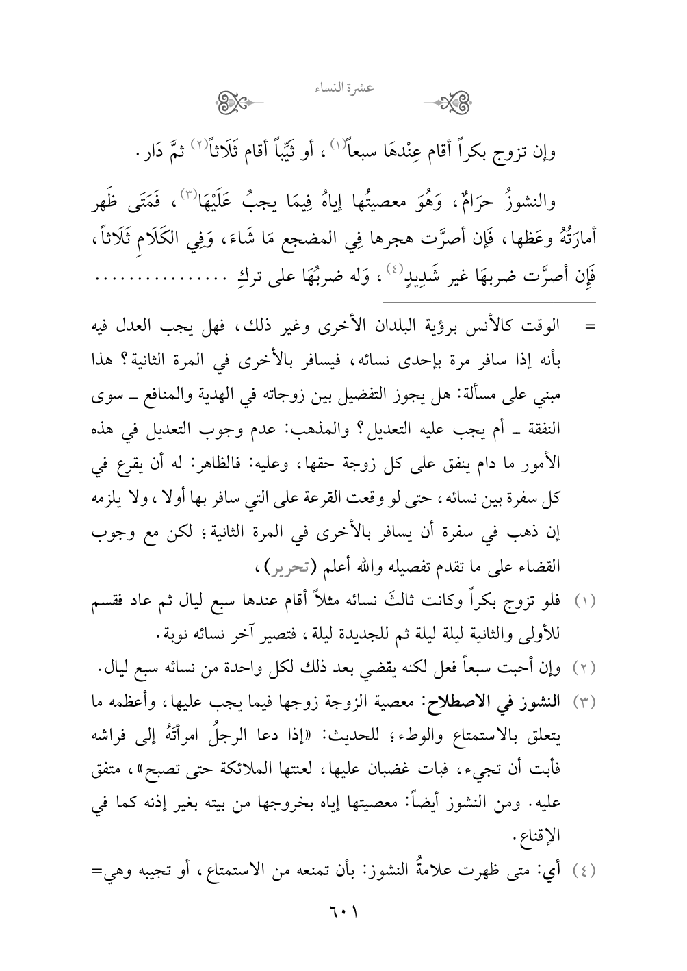 (¬٣) النشوز في الاصطلاح: معصية الزوجة زوجها فيما يجب عليها، وأعظمه ما يتعلق بالاستمتاع والوطء؛ للحديث: «إذا دعا الرجلُ امرأتَهُ إلى فراشه فأبت أن تجيء، فبات غضبان عليها، لعنتها الملائكة حتى تصبح»، متفق عليه. ومن النشوز أيضاً: معصيتها إياه بخروجها من بيته بغير إذنه كما في الإقناع.