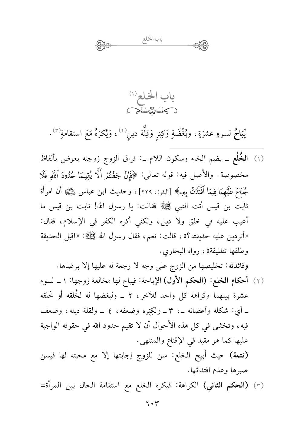 (¬١) الخُلْع - بضم الخاء وسكون اللام -: فراق الزوج زوجته بعوض بألفاظ مخصوصة. والأصل فيه: قوله تعالى: {فإن خفتم ألا يقيما حدود الله فلا جناح عليهما فيما افتدت به} [البقرة، ٢٢٩]، وحديث ابن عباس رضي الله عنهما أن امرأة ثابت بن قيس أتت النبي صلى الله عليه وسلم فقالت: يا رسول الله! ثابت بن قيس ما أعيب عليه في خلق ولا دين، ولكني أكره الكفر في الإسلام، فقال: «أتردين عليه حديقته؟ »، قالت: نعم، فقال رسول الله صلى الله عليه وسلم: «اقبل الحديقة وطلقها تطليقة»، رواه البخاري.