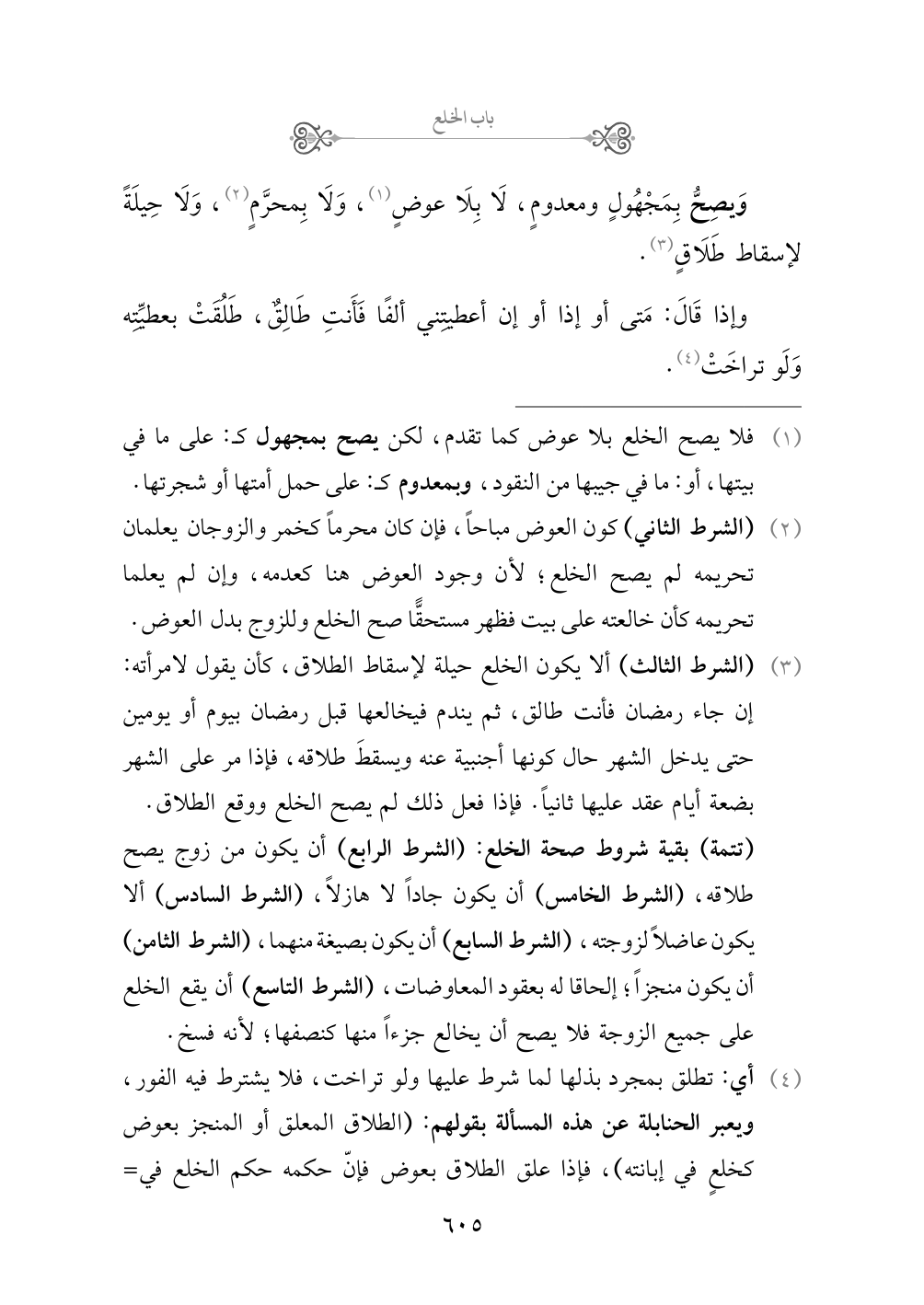 (¬٤) أي: تطلق بمجرد بذلها لما شرط عليها ولو تراخت، فلا يشترط فيه الفور، ويعبر الحنابلة عن هذه المسألة بقولهم: (الطلاق المعلق أو المنجز بعوض كخلعٍ في إبانته)، فإذا علق الطلاق بعوض فإنّ حكمه حكم الخلع في حصول البينونة، لكنه يحسب من عدد طلقاته. والتعليق الصادر من الزوج يلزمه وليس له إبطاله.