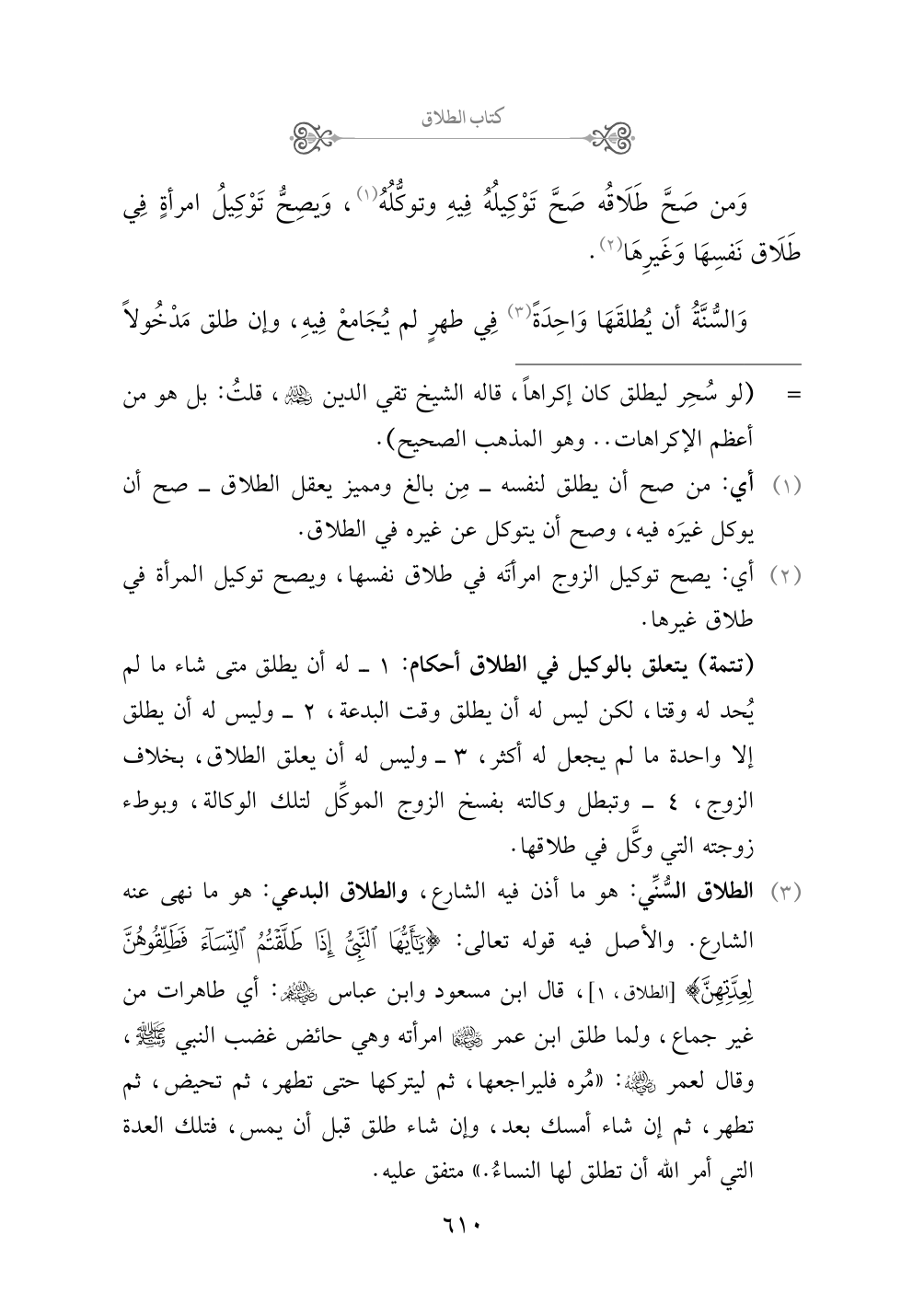 (¬٣) الطلاق السُّنِّي: هو ما أذن فيه الشارع، والطلاق البدعي: هو ما نهى عنه الشارع. والأصل فيه قوله تعالى: {يا أيها النبي إذا طلقتم النساء فطلقوهن لعدتهن} [الطلاق، ١]، قال ابن مسعود وابن عباس رضي الله عنهم: أي طاهرات من غير جماع، ولما طلق ابن عمر رضي الله عنهما امرأته وهي حائض غضب النبي صلى الله عليه وسلم، وقال لعمر رضي الله عنه: «مُره فليراجعها، ثم ليتركها حتى تطهر، ثم تحيض، ثم تطهر، ثم إن شاء أمسك بعد، وإن شاء طلق قبل أن يمس، فتلك العدة التي أمر الله أن تطلق لها النساءُ.» متفق عليه.