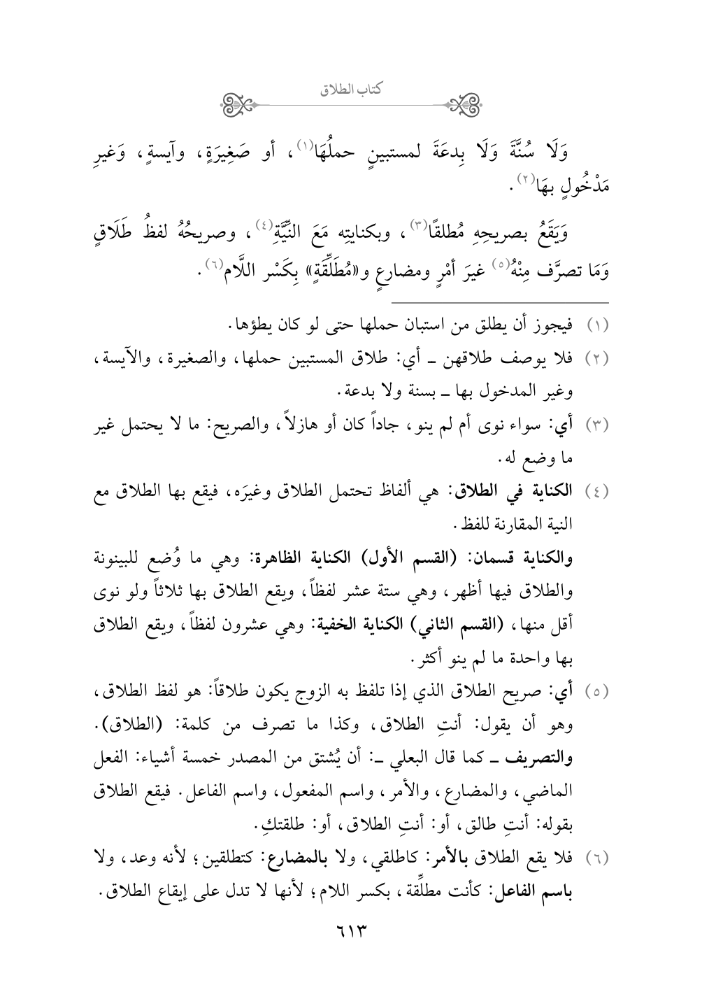 (¬٢) فلا يوصف طلاقهن - أي: طلاق المستبين حملها، والصغيرة، والآيسة، وغير المدخول بها - بسنة ولا بدعة.