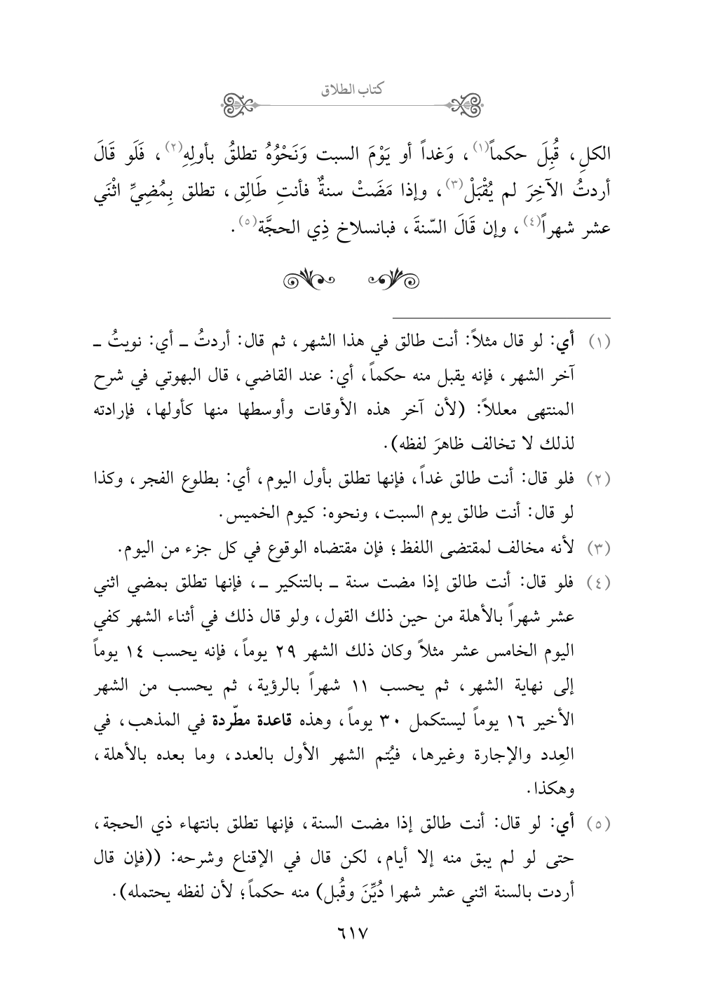(¬٤) فلو قال: أنت طالق إذا مضت سنة - بالتنكير -، فإنها تطلق بمضي اثني عشر شهراً بالأهلة من حين ذلك القول، ولو قال ذلك في أثناء الشهر كفي اليوم الخامس عشر مثلاً وكان ذلك الشهر ٢٩ يوماً، فإنه يحسب ١٤ يوماً إلى نهاية الشهر، ثم يحسب ١١ شهراً بالرؤية، ثم يحسب من الشهر الأخير ١٦ يوماً ليستكمل ٣٠ يوماً، وهذه قاعدة مطّردة في المذهب، في العِدد والإجارة وغيرها، فيُتم الشهر الأول بالعدد، وما بعده بالأهلة، وهكذا ..