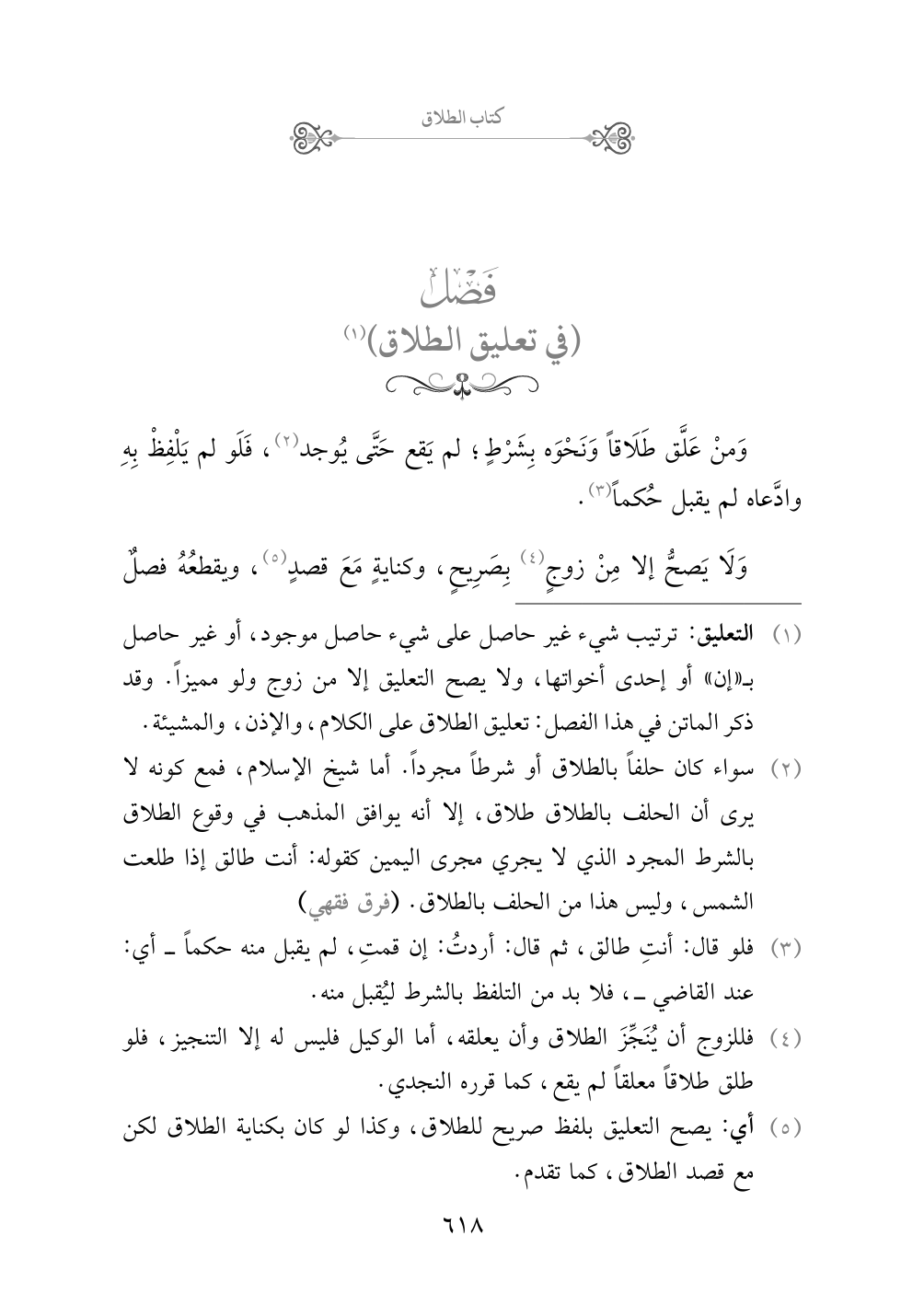 (¬١) التعليق: ترتيب شيء غير حاصل على شيء حاصل موجود، أو غير حاصل بـ «إن» أو إحدى أخواتها، ولا يصح التعليق إلا من زوج ولو مميزاً. وقد ذكر الماتن في هذا الفصل: تعليق الطلاق على الكلام، والإذن، والمشيئة.