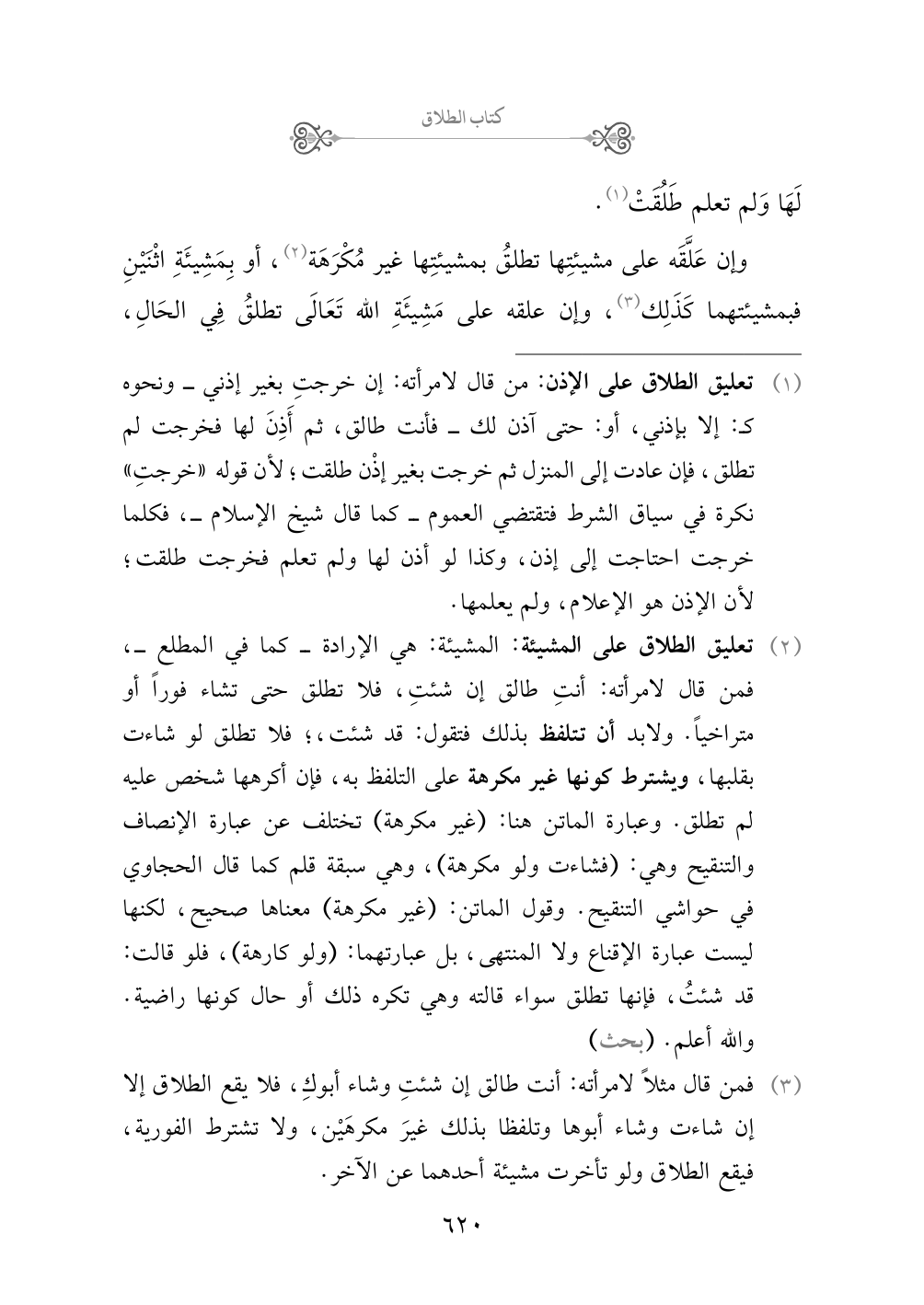 (¬٢) تعليق الطلاق على المشيئة: المشيئة: هي الإرادة - كما في المطلع -، فمن قال لامرأته: أنتِ طالق إن شئتِ، فلا تطلق حتى تشاء فوراً أو متراخياً. ولابد أن تتلفظ بذلك فتقول: قد شئت، ؛ فلا تطلق لو شاءت بقلبها، ويشترط كونها غير مكرهة على التلفظ به، فإن أكرهها شخص عليه لم تطلق. وعبارة الماتن هنا: (غير مكرهة) تختلف عن عبارة الإنصاف والتنقيح وهي: (فشاءت ولو مكرهة)، وهي سبقة قلم كما قال الحجاوي في حواشي التنقيح. وقول الماتن: (غير مكرهة) معناها صحيح، لكنها ليست عبارة الإقناع ولا المنتهى، بل عبارتهما: (ولو كارهة)، فلو قالت: قد شئتُ، فإنها تطلق سواء قالته وهي تكره ذلك أو حال كونها راضية. والله أعلم. (بحث)
