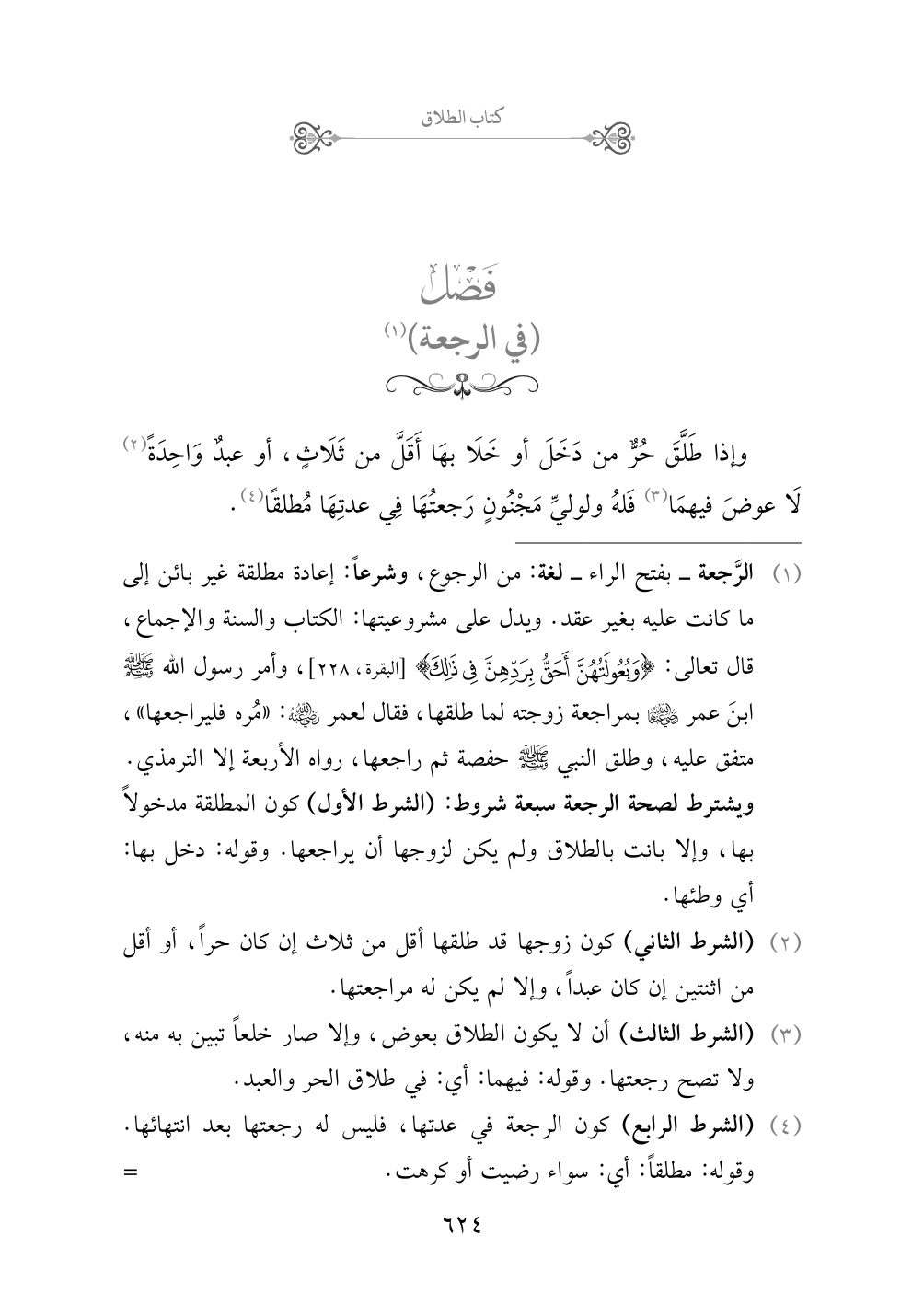 (¬١) الرَّجعة - بفتح الراء - لغة: من الرجوع، وشرعاً: إعادة مطلقة غير بائن إلى ما كانت عليه بغير عقد. ويدل على مشروعيتها: الكتاب والسنة والإجماع، قال تعالى: {وبعولتهن أحق بردهن في ذلك} [البقرة، ٢٢٨]، وأمر رسول الله صلى الله عليه وسلم ابنَ عمر رضي الله عنهما بمراجعة زوجته لما طلقها، فقال لعمر رضي الله عنه: «مُره فليراجعها»، متفق عليه، وطلق النبي صلى الله عليه وسلم حفصة ثم راجعها، رواه الأربعة إلا الترمذي.