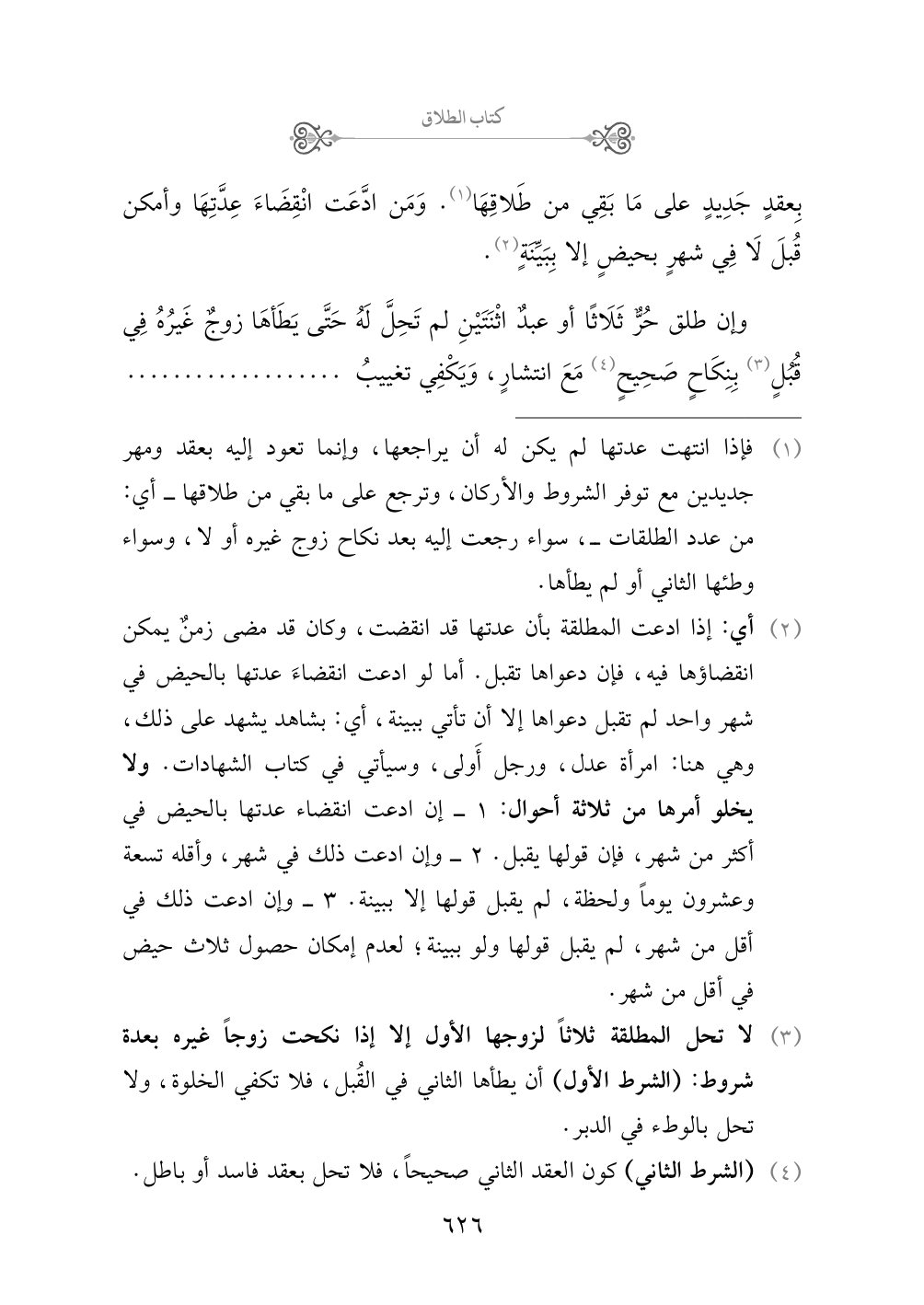 (¬٢) أي: إذا ادعت المطلقة بأن عدتها قد انقضت، وكان قد مضى زمنٌ يمكن انقضاؤها فيه، فإن دعواها تقبل. أما لو ادعت انقضاءَ عدتها بالحيض في شهر واحد لم تقبل دعواها إلا أن تأتي ببينة، أي: بشاهد يشهد على ذلك، وهي هنا: امرأة عدل، ورجل أَولى، وسيأتي في كتاب الشهادات. ولا يخلو أمرها من ثلاثة أحوال: ١ - إن ادعت انقضاء عدتها بالحيض في أكثر من شهر، فإن قولها يقبل. ٢ - وإن ادعت ذلك في شهر، وأقله تسعة وعشرون يوماً ولحظة، لم يقبل قولها إلا ببينة. ٣ - وإن ادعت ذلك في أقل من شهر، لم يقبل قولها ولو ببينة؛ لعدم إمكان حصول ثلاث حيض في أقل من شهر.