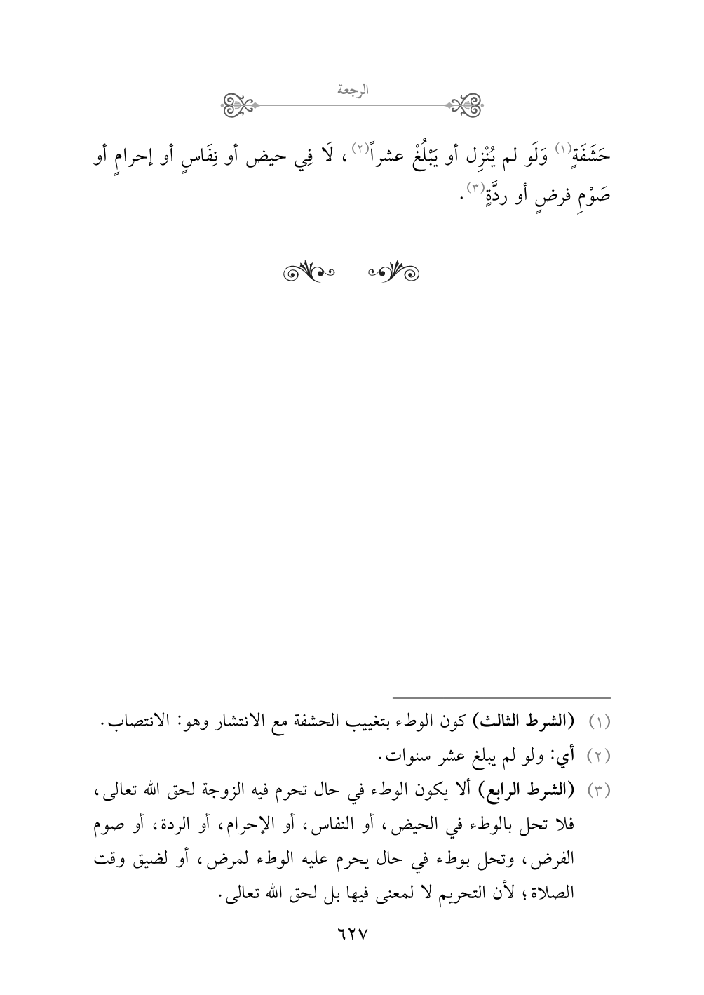 (¬٣) (الشرط الرابع) ألا يكون الوطء في حال تحرم فيه الزوجة لحق الله تعالى، فلا تحل بالوطء في الحيض، أو النفاس، أو الإحرام، أو الردة، أو صوم الفرض، وتحل بوطء في حال يحرم عليه الوطء لمرض، أو لضيق وقت الصلاة؛ لأن التحريم لا لمعنى فيها بل لحق الله تعالى.