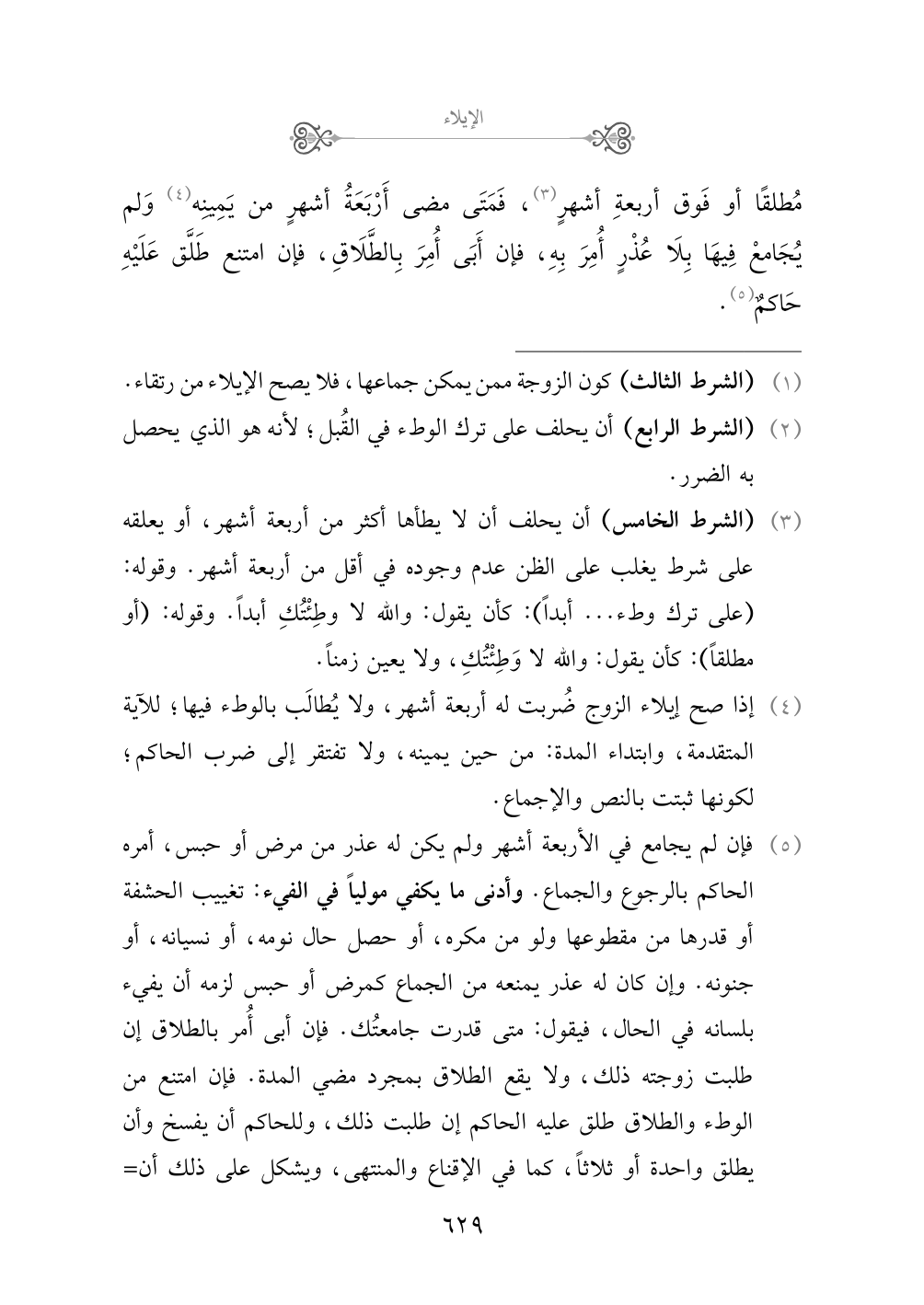 (¬١) (الشرط الخامس) أن يحلف أن لا يطأها أكثر من أربعة أشهر، أو يعلقه على شرط يغلب على الظن عدم وجوده في أقل من أربعة أشهر. وقوله: (على ترك وطء ... أبداً): كأن يقول: والله لا وطِئْتُكِ أبداً. وقوله: (أو مطلقاً): كأن يقول: والله لا وَطِئْتُكِ، ولا يعين زمناً.