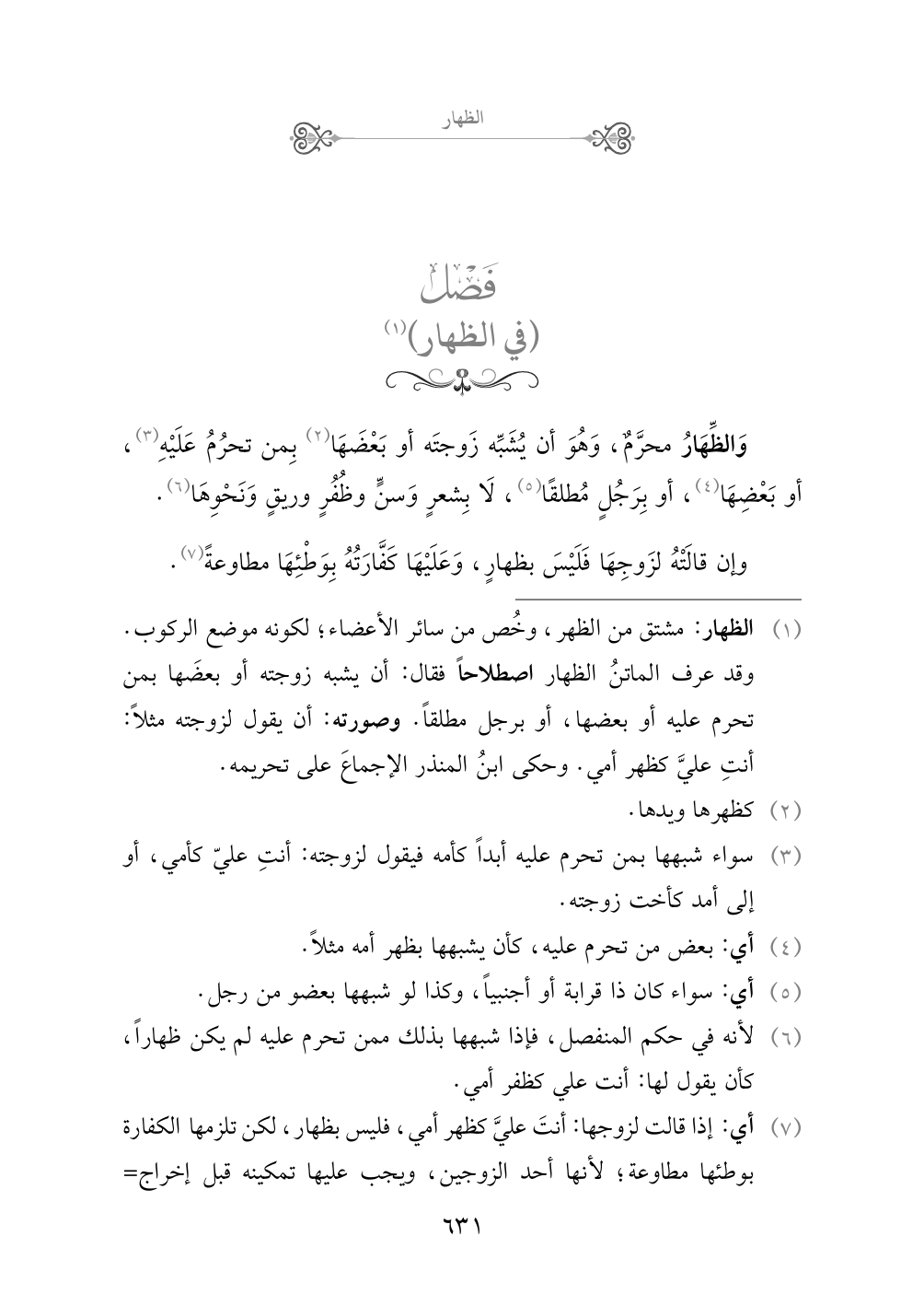 (¬١) الظهار: مشتق من الظهر، وخُص من سائر الأعضاء؛ لكونه موضع الركوب. وقد عرف الماتنُ الظهار اصطلاحاً فقال: أن يشبه زوجته أو بعضَها بمن تحرم عليه أو بعضها، أو برجل مطلقاً. وصورته: أن يقول لزوجته مثلاً: أنتِ عليَّ كظهر أمي. وحكى ابنُ المنذر الإجماعَ على تحريمه.