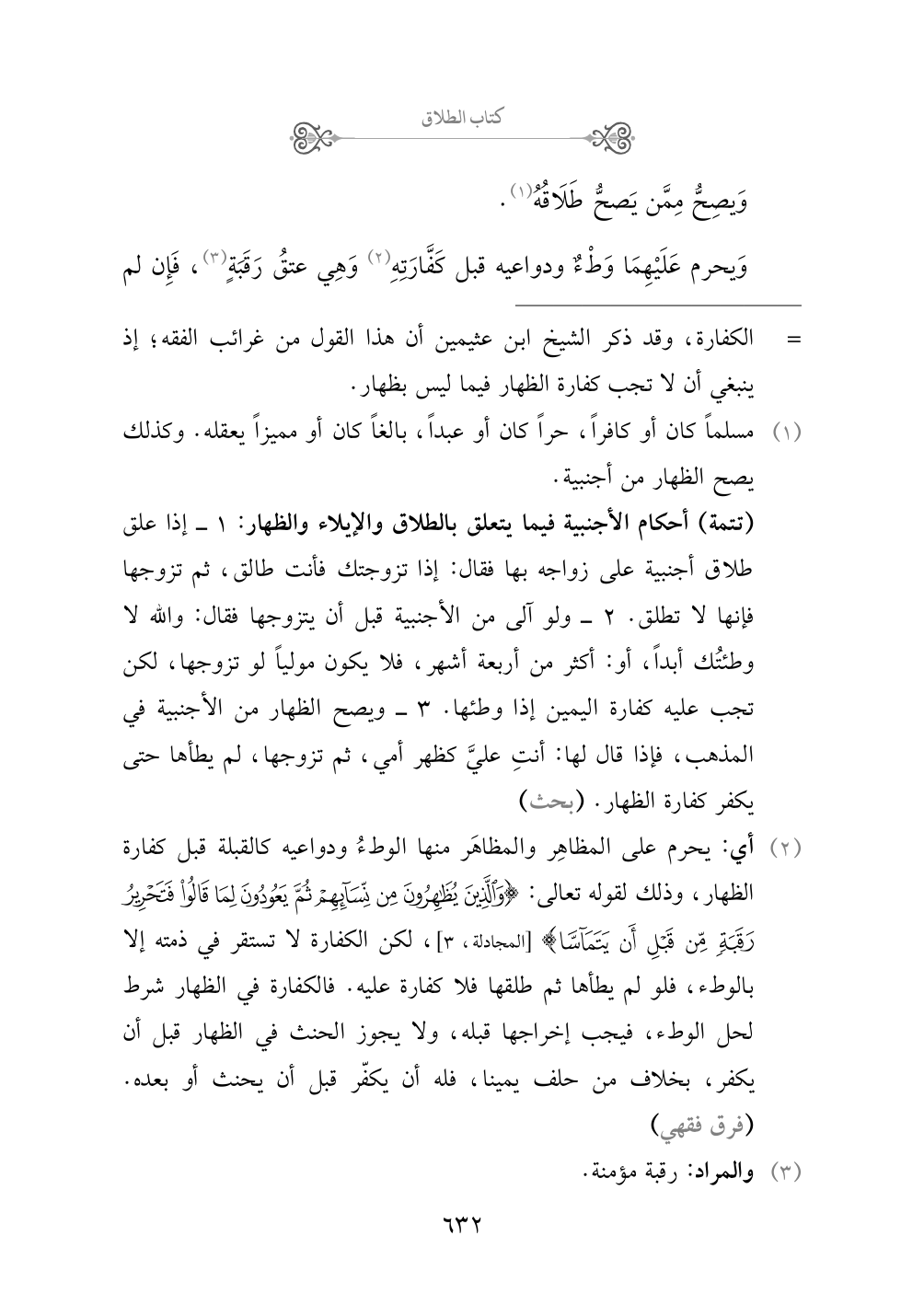 (¬٢) أي: يحرم على المظاهِر والمظاهَر منها الوطءُ ودواعيه كالقبلة قبل كفارة الظهار، وذلك لقوله تعالى: {والذين يظاهرون من نسائهم ثم يعودون لما قالوا فتحرير رقبة من قبل أن يتماسا} [المجادلة، ٣]، لكن الكفارة لا تستقر في ذمته إلا بالوطء، فلو لم يطأها ثم طلقها فلا كفارة عليه. فالكفارة في الظهار شرط لحل الوطء، فيجب إخراجها قبله، ولا يجوز الحنث في الظهار قبل أن يكفر، بخلاف من حلف يمينًا، فله أن يكفّر قبل أن يحنث أو بعده. (فرق فقهي)