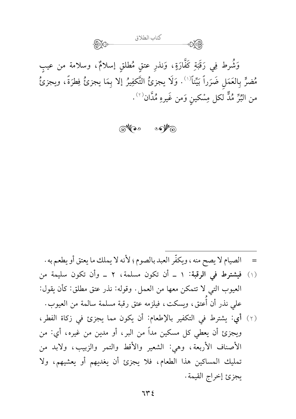 وَشُرط فِي رَقَبَةِ كَفَّارَةٍ، وَنذرِ عتقٍ مُطلقٍ إسلامٌ، وسلامة من عيبٍ مُضرٍّ بِالعَمَلِ ضَرَراً بَيِّناً (¬١). وَلَا يجزئُ التَّكفِيرُ إلا بِمَا يجزئُ فِطرَةً، ويجزئُ من البُرِّ مُدٌّ لكل مِسْكينٍ وَمن غَيرهِ مُدَّان (¬٢).