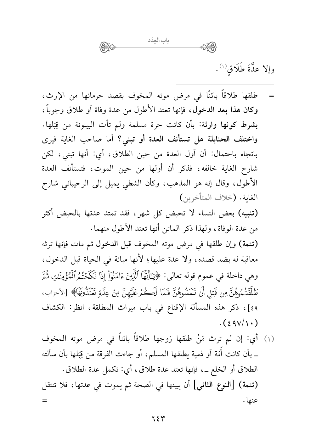 (¬١) أي: إن لم ترث مَنْ طلقها زوجها طلاقاً بائناً في مرض موته المخوف - بأن كانت أَمَة أو ذمية يطلقها المسلم، أو جاءت الفرقة من قِبَلها بأن سألته الطلاق أو الخلع -، فإنها تعتد عدة طلاق، أي: تكمل عدة الطلاق.