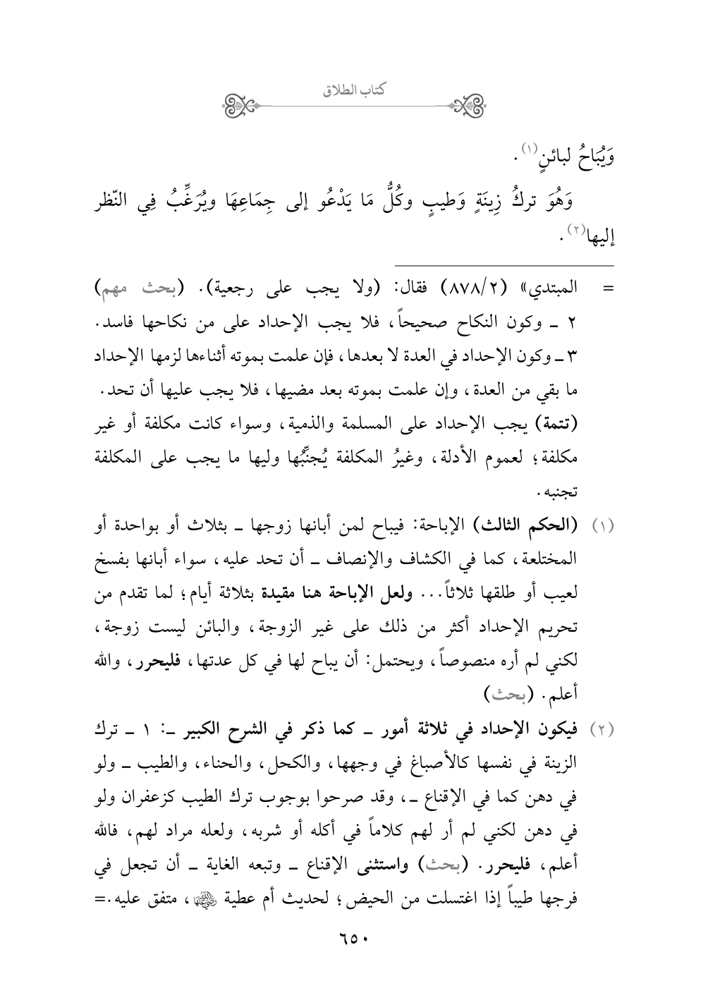 (¬٢) فيكون الإحداد في ثلاثة أمور - كما ذكر في الشرح الكبير -: ١ - ترك الزينة في نفسها كالأصباغ في وجهها، والكحل، والحناء، والطيب - ولو في دهن كما في الإقناع -، وقد صرحوا بوجوب ترك الطيب كزعفران ولو في دهن لكني لم أر لهم كلاماً في أكله أو شربه، ولعله مراد لهم، فالله أعلم، فليحرر. (بحث) واستثنى الإقناع - وتبعه الغاية - أن تجعل في فرجها طيباً إذا اغتسلت من الحيض؛ لحديث أم عطية رضي الله عنها، متفق عليه. ٢ - وترك الزينة في الثياب، فتترك الثياب الجميلة الملونة. ٣ - وترك الحلي.