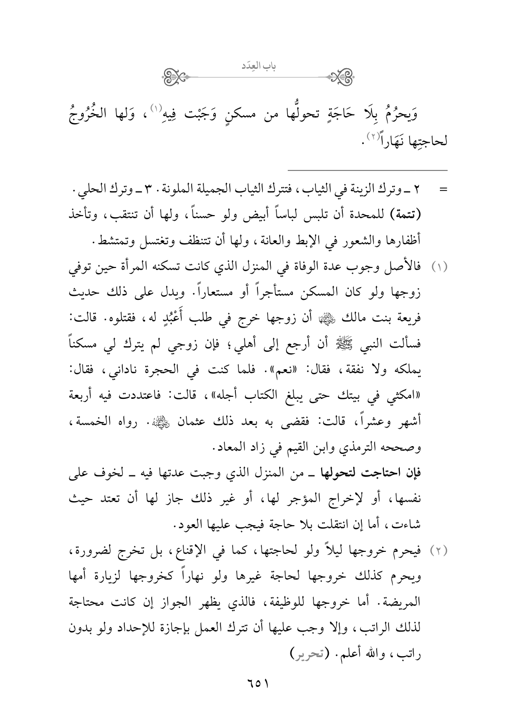 (¬٢) فيحرم خروجها ليلاً ولو لحاجتها، كما في الإقناع، بل تخرج لضرورة، ويحرم كذلك خروجها لحاجة غيرها ولو نهاراً كخروجها لزيارة أمها المريضة. أما خروجها للوظيفة، فالذي يظهر الجواز إن كانت محتاجة لذلك الراتب، وإلا وجب عليها أن تترك العمل بإجازة للإحداد ولو بدون راتب، والله أعلم. (تحرير)