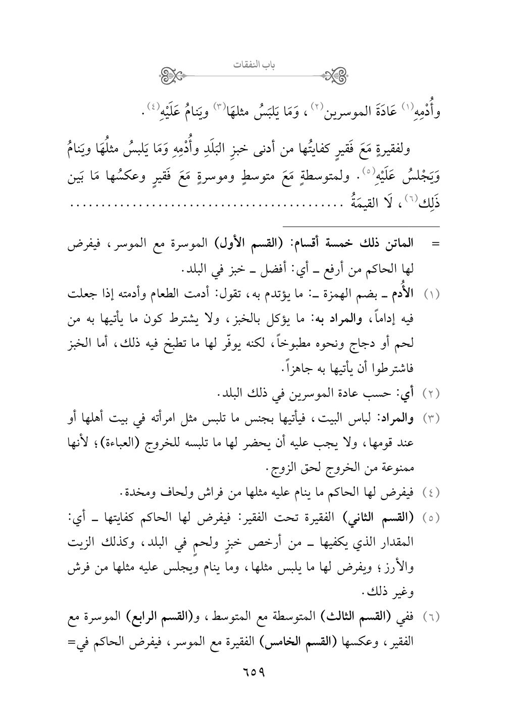 (¬٦) ففي (القسم الثالث) المتوسطة مع المتوسط، و (القسم الرابع) الموسرة مع الفقير، وعكسها (القسم الخامس) الفقيرة مع الموسر، فيفرض الحاكم في هذه الأقسام الثلاثة ما بين ذلك، أي: نفقة المتوسطين، فيجب على الزوج إذن أن يأتيها بما كان متوسط الجودة من الخبز واللحم وغير ذلك.
