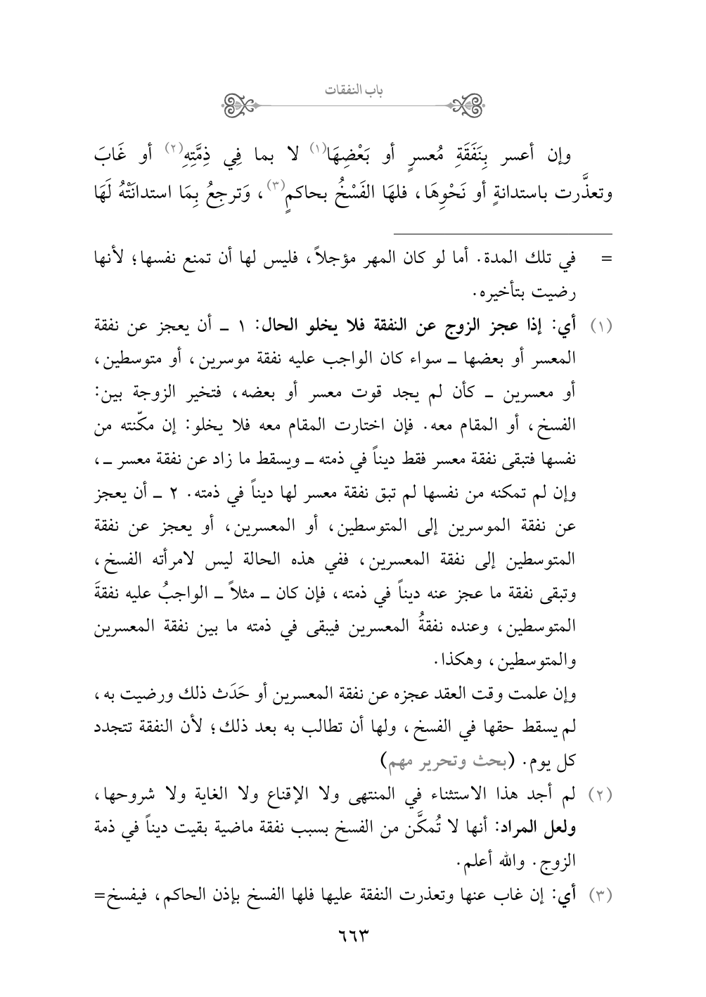 (¬٢) لم أجد هذا الاستثناء في المنتهى ولا الإقناع ولا الغاية ولا شروحها، ولعل المراد: أنها لا تُمكَّن من الفسخ بسبب نفقة ماضية بقيت ديناً في ذمة الزوج. والله أعلم.