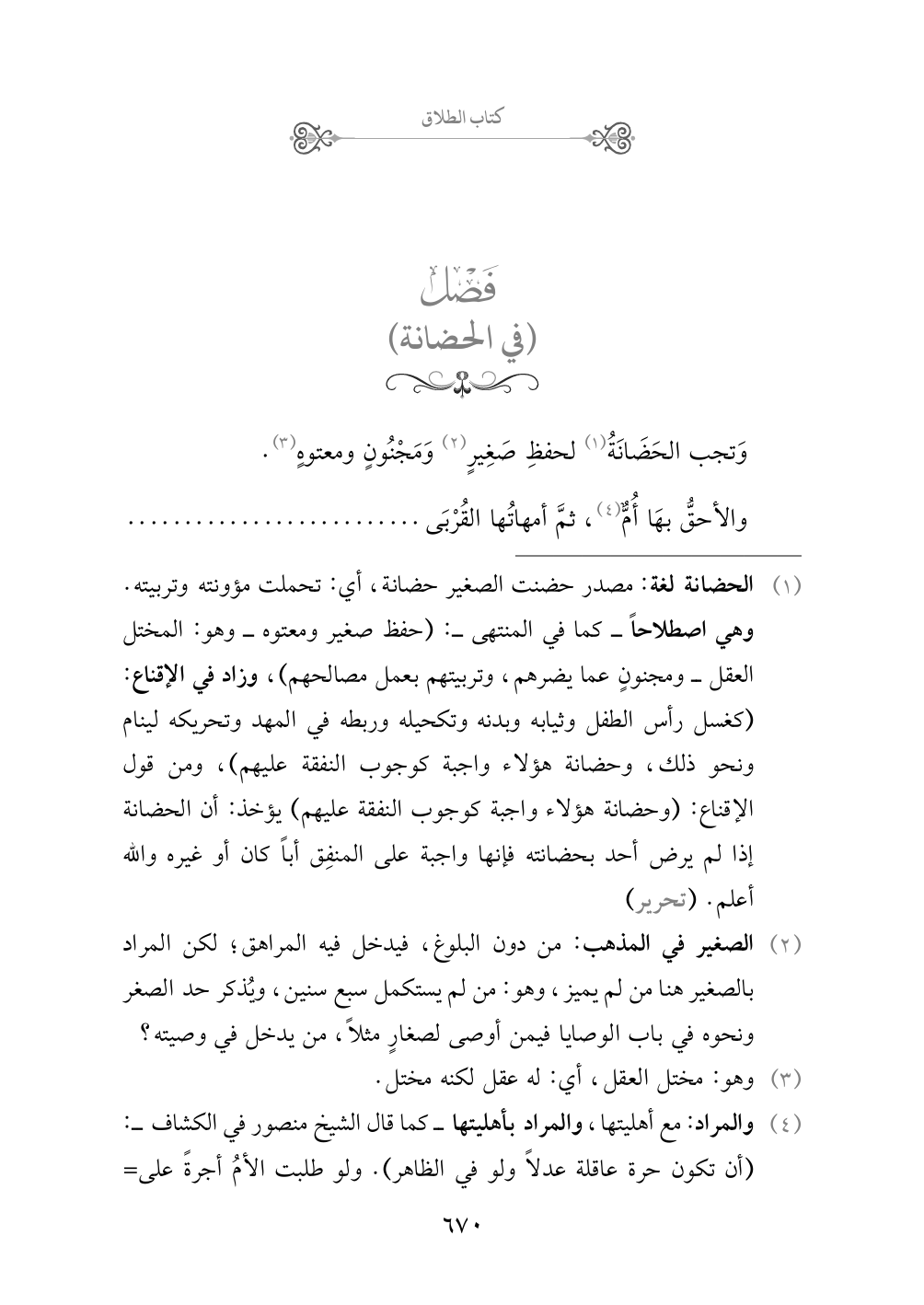 (¬١) الحضانة لغة: مصدر حضنت الصغير حضانة، أي: تحملت مؤونته وتربيته. وهي اصطلاحاً - كما في المنتهى -: (حفظ صغير ومعتوه - وهو: المختل العقل - ومجنونٍ عما يضرهم، وتربيتهم بعمل مصالحهم)، وزاد في الإقناع: (كغسل رأس الطفل وثيابه وبدنه وتكحيله وربطه في المهد وتحريكه لينام ونحو ذلك، وحضانة هؤلاء واجبة كوجوب النفقة عليهم)، ومن قول الإقناع: (وحضانة هؤلاء واجبة كوجوب النفقة عليهم) يؤخذ: أن الحضانة إذا لم يرض أحد بحضانته فإنها واجبة على المنفِق أباً كان أو غيره والله أعلم. (تحرير)