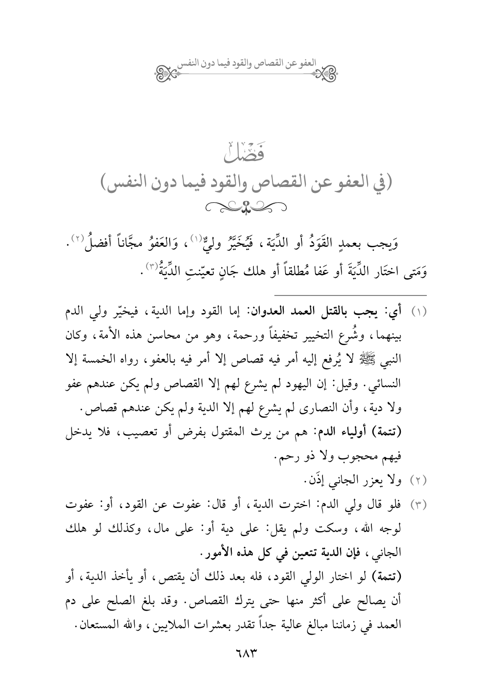 (¬١) أي: يجب بالقتل العمد العدوان: إما القود وإما الدية، فيخيّر ولي الدم بينهما، وشُرع التخيير تخفيفاً ورحمة، وهو من محاسن هذه الأمة، وكان النبي صلى الله عليه وسلم لا يُرفع إليه أمر فيه قصاص إلا أمر فيه بالعفو، رواه الخمسة إلا النسائي. وقيل: إن اليهود لم يشرع لهم إلا القصاص ولم يكن عندهم عفو ولا دية، وأن النصارى لم يشرع لهم إلا الدية ولم يكن عندهم قصاص.
