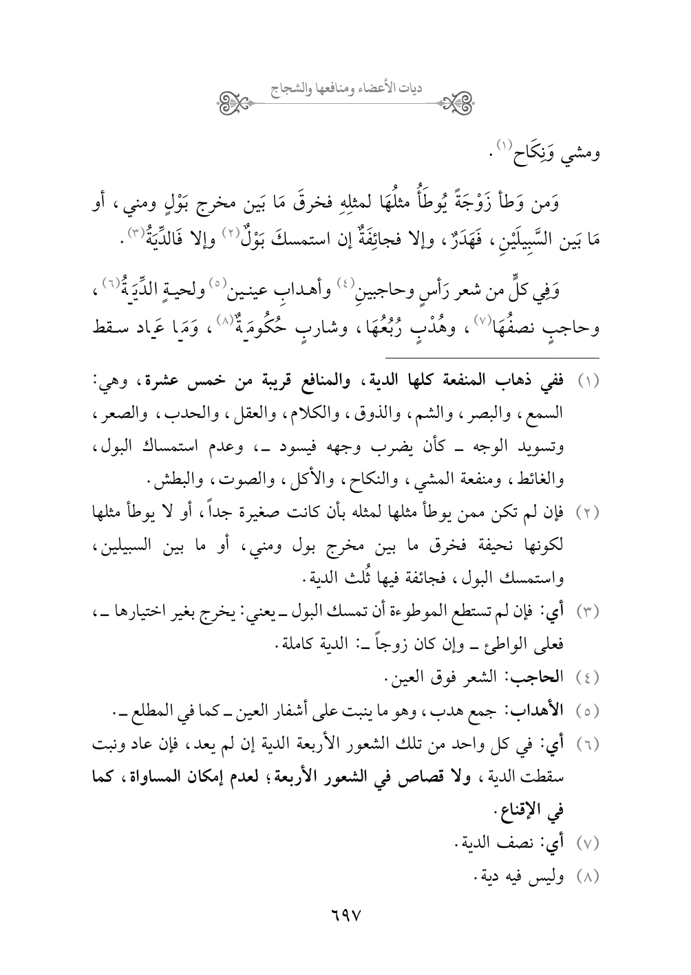(¬١) ففي ذهاب المنفعة كلها الدية، والمنافع قريبة من خمس عشرة، وهي: السمع، والبصر، والشم، والذوق، والكلام، والعقل، والحدب، والصعر، وتسويد الوجه - كأن يضرب وجهه فيسود -، وعدم استمساك البول، والغائط، ومنفعة المشي، والنكاح، والأكل، والصوت، والبطش.