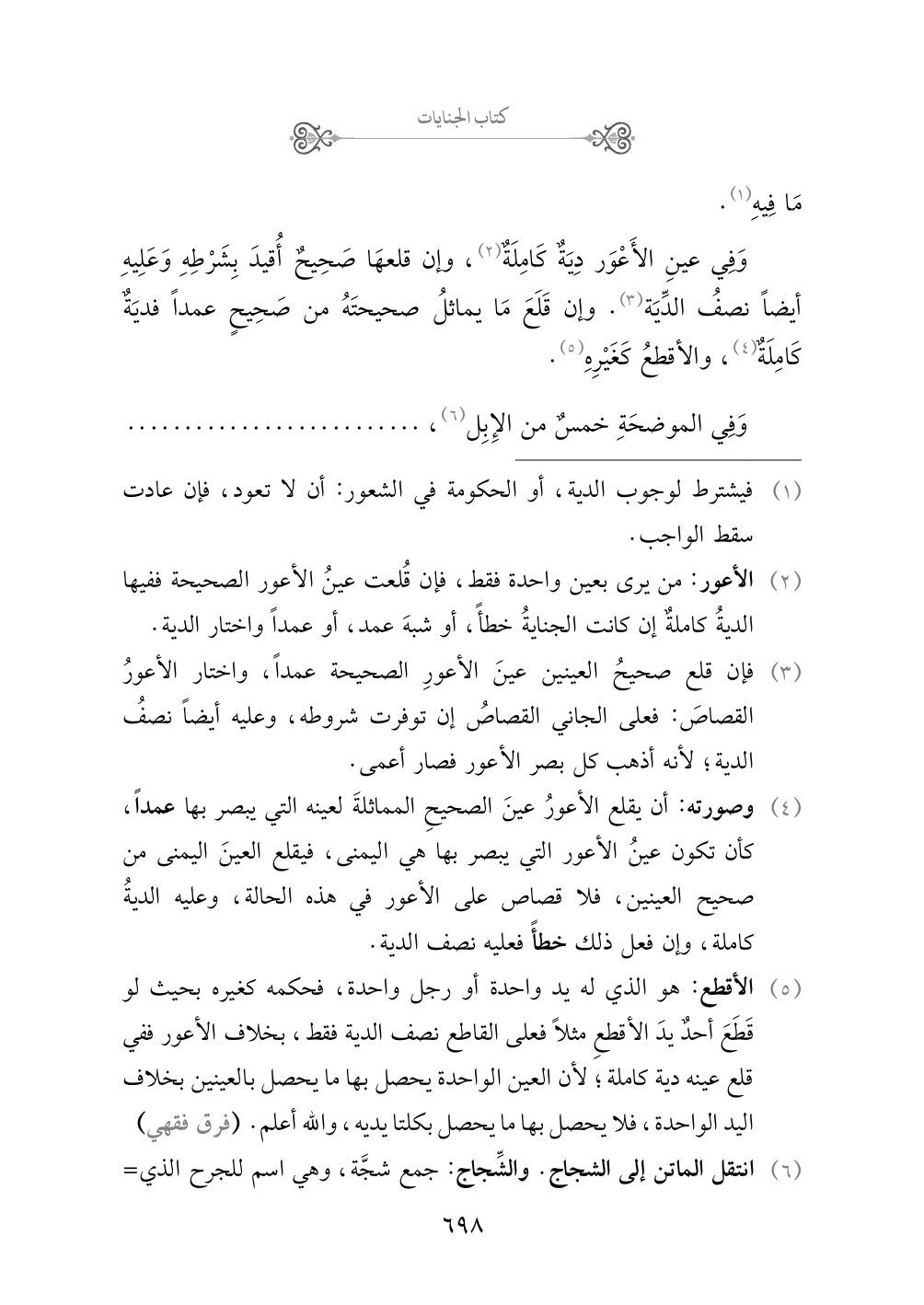 (¬٢) الأعور: من يرى بعين واحدة فقط، فإن قُلعت عينُ الأعور الصحيحة ففيها الديةُ كاملةٌ إن كانت الجنايةُ خطأً، أو شبهَ عمد، أو عمداً واختار الدية.