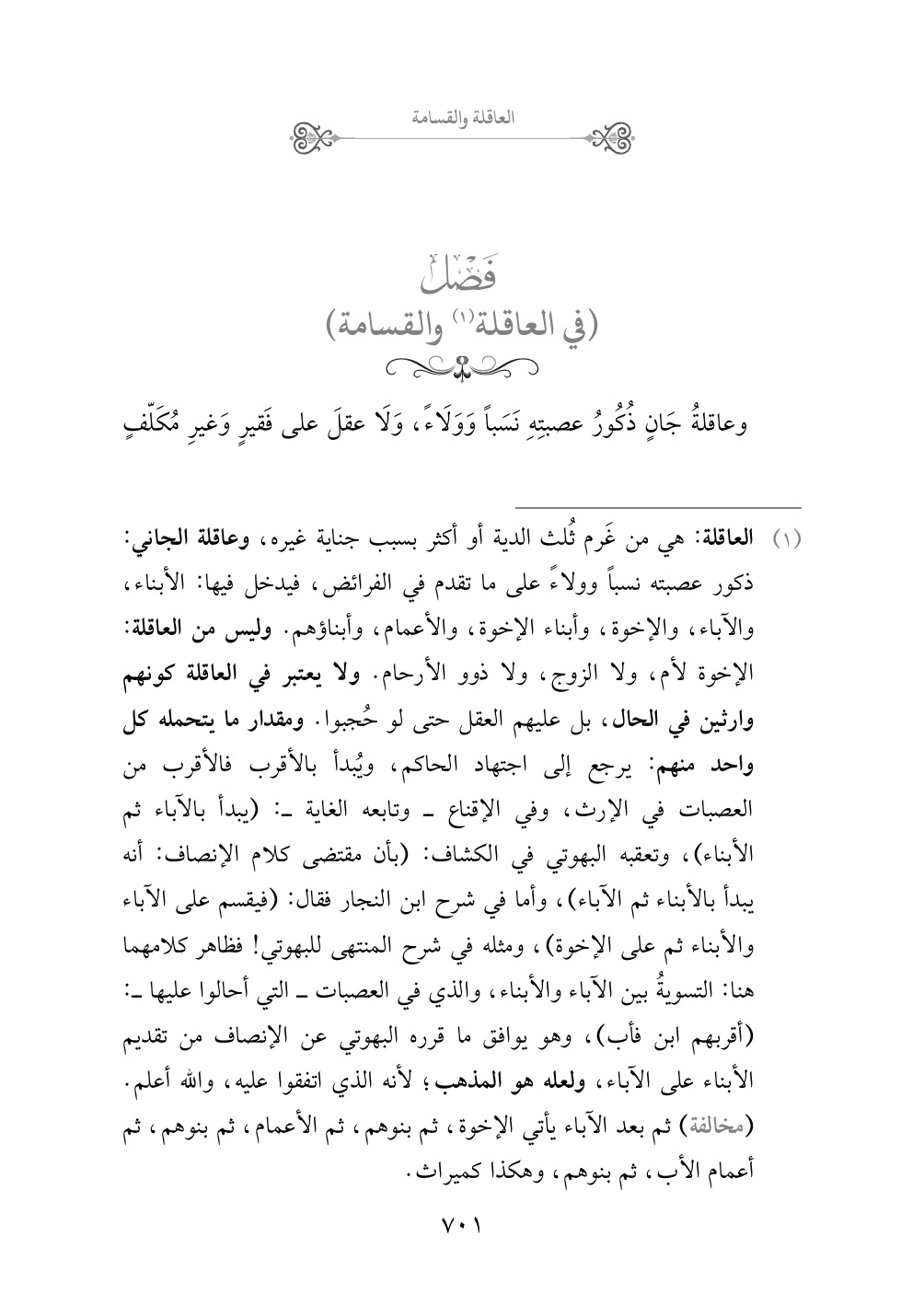 (¬١) العاقلة: هي من غَرم ثُلث الدية أو أكثر بسبب جناية غيره، وعاقلة الجاني: ذكور عصبته نسباً وولاءً على ما تقدم في الفرائض، فيدخل فيها: الأبناء، والآباء، والإخوة، وأبناء الإخوة، والأعمام، وأبناؤهم. وليس من العاقلة: الإخوة لأم، ولا الزوج، ولا ذوو الأرحام. ولا يعتبر في العاقلة كونهم وارثين في الحال، بل عليهم العقل حتى لو حُجبوا. ومقدار ما يتحمله كل واحد منهم: يرجع إلى اجتهاد الحاكم، ويُبدأ بالأقرب فالأقرب من العصبات في الإرث، وفي الإقناع - وتابعه الغاية -: (يبدأ بالآباء ثم الأبناء)، وتعقبه البهوتي في الكشاف: (بأن مقتضى كلام الإنصاف: أنه يبدأ بالأبناء ثم الآباء)، وأما في شرح ابن النجار فقال: (فيقسم على الآباء والأبناء ثم على الإخوة)، ومثله في شرح المنتهى للبهوتي! فظاهر كلامهما هنا: التسويةُ بين الآباء والأبناء، والذي في العصبات - التي أحالوا عليها -: (أقربهم ابن فأب)، وهو يوافق ما قرره البهوتي عن الإنصاف من تقديم الأبناء على الآباء، ولعله هو المذهب؛ لأنه الذي اتفقوا عليه، والله أعلم. (مخالفة) ثم بعد الآباء يأتي الإخوة، ثم بنوهم، ثم الأعمام، ثم بنوهم، ثم أعمام الأب، ثم بنوهم، وهكذا كميراث.