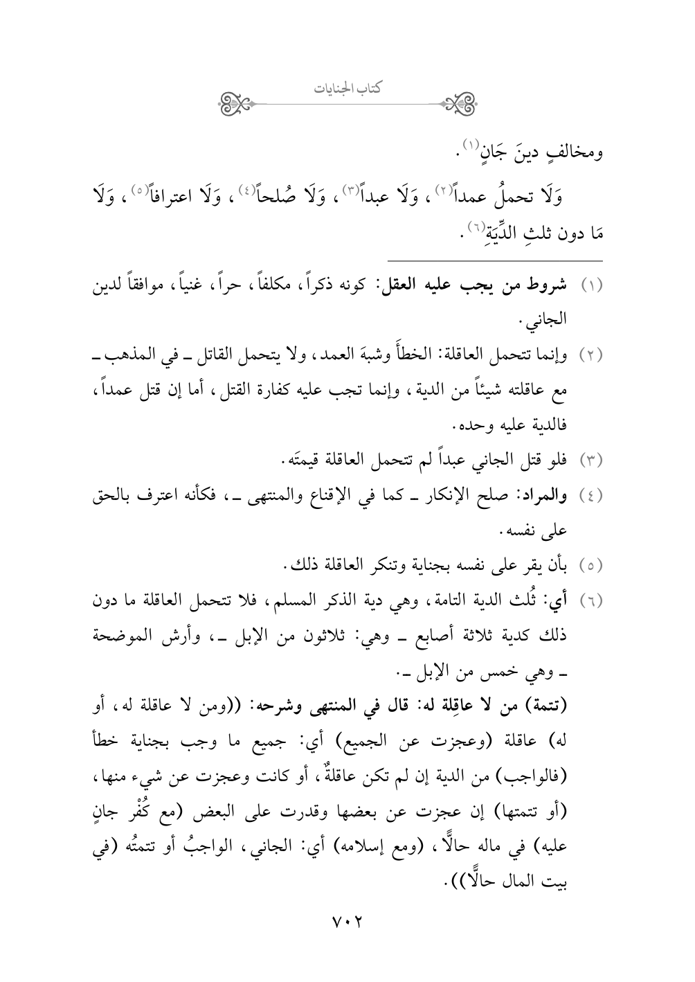 (¬١) شروط من يجب عليه العقل: كونه ذكراً، مكلفاً، حراً، غنياً، موافقاً لدين الجاني.