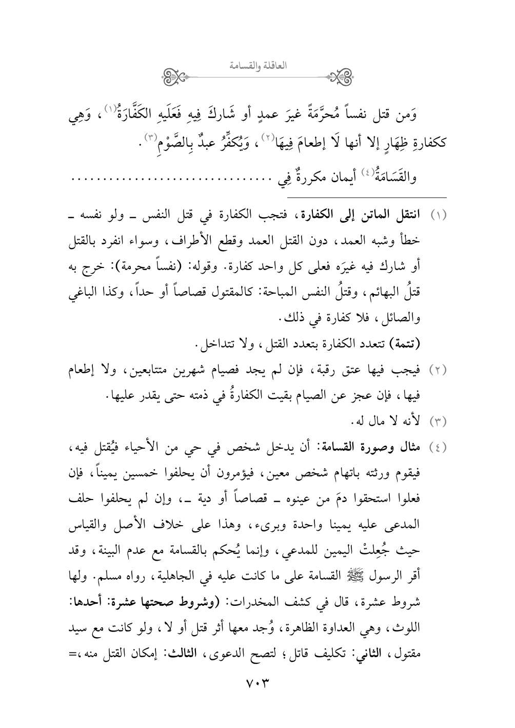 (¬٤) مثال وصورة القسامة: أن يدخل شخص في حي من الأحياء فيُقتل فيه، فيقوم ورثته باتهام شخص معين، فيؤمرون أن يحلفوا خمسين يميناً، فإن فعلوا استحقوا دمَ من عينوه - قصاصاً أو دية -، وإن لم يحلفوا حلف المدعى عليه يمينا واحدة وبراء، وهذا على خلاف الأصل والقياس حيث جُعِلتْ اليمين للمدعي، وإنما يُحكم بالقسامة مع عدم البينة، وقد أقر الرسول صلى الله عليه وسلم القسامة على ما كانت عليه في الجاهلية، رواه مسلم. ولها شروط عشرة، قال في كشف المخدرات: (وشروط صحتها عشرة: أحدها: اللوث، وهي العداوة الظاهرة، وُجد معها أثر قتل أو لا، ولو كانت مع سيد مقتول، الثاني: تكليف قاتل؛ لتصح الدعوى، الثالث: إمكان القتل منه، فلا تصح من نحو زَمِن، الرابع: وصف القتل في الدعوى كأن يقول: جرحه بسيف ونحوه في محل كذا من بدنه، أو خنقه ونحوه، فلو استحلفه حاكم قبل تفصيله لم يعتد به، الخامس: طلب جميع الورثة، السادس: اتفاقهم على الدعوى فلا يكفي عدم تكذيب بعضهم بعضاً؛ إذ الساكت لا ينسب إليه حكم، السابع: اتفاقهم على القتل، فإن أنكر بعضهم فلا قسامة، الثامن: اتفاقهم على عين قاتل نصاً، فلو قال: بعضهم قتله زيد، وبعضهم: عمرو، فلا قسامة، التاسع: كون فيهم ذكور مكلفون، ولا يقدح غيبة بعضهم ولا عدم تكليفه ولا نكوله، فلذكر حاضر مكلف أن يحلف بقسطه من الأيمان، ويستحق نصيبه من الدية، ولمن قدم أو كلف أن يحلف بقسط نصيبه ويأخذه، العاشر: كون الدعوى على واحد معين فلو قالوا قتله هذا مع آخر أو قتله أحدهما فلا قسامة) ..
