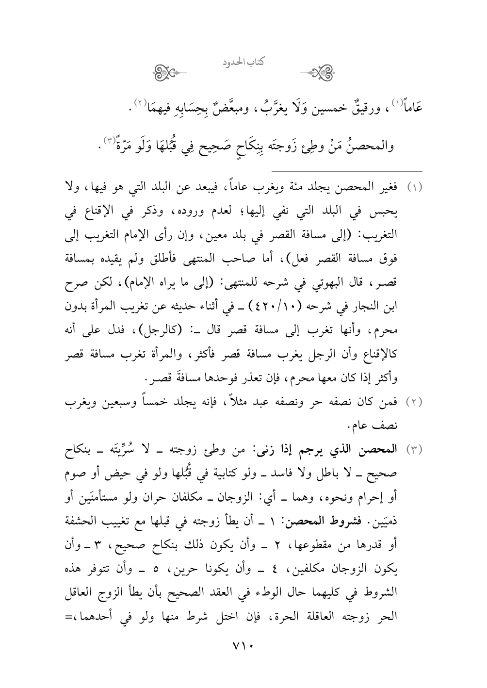 (¬٣) المحصن الذي يرجم إذا زنى: من وطئ زوجته - لا سُرِّيتَه - بنكاح صحيح - لا باطل ولا فاسد - ولو كتابية في قُبُلها ولو في حيض أو صوم أو إحرام ونحوه، وهما - أي: الزوجان - مكلفان حران ولو مستأمنَين أو ذميَين. فشروط المحصن: ١ - أن يطأ زوجته في قبلها مع تغييب الحشفة أو قدرها من مقطوعها، ٢ - وأن يكون ذلك بنكاح صحيح، ٣ - وأن يكون الزوجان مكلفين، ٤ - وأن يكونا حرين، ٥ - وأن تتوفر هذه الشروط في كليهما حال الوطء في العقد الصحيح بأن يطأ الزوج العاقل الحر زوجته العاقلة الحرة، فإن اختل شرط منها ولو في أحدهما، فلا إحصان لواحد منهما؛ لأنه وطء لم يحصن أحدهما فلم يحصن الآخر كالتسري، ومن ذلك: لو تزوج بنتَ تسعٍ، فإن العقد صحيح لكنه لا يصير به محصناً؛ لأنها غير مكلفة.