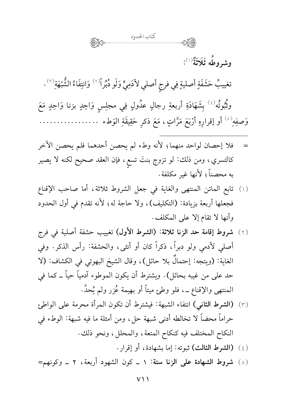 (¬١) تابع الماتن المنتهى والغاية في جعل الشروط ثلاثة، أما صاحب الإقناع فجعلها أربعة بزيادة: (التكليف)، ولا حاجة له؛ لأنه تقدم في أول الحدود وأنها لا تقام إلا على المكلف.