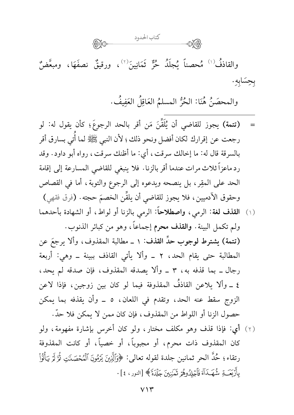 (¬١) القذف لغة: الرمي، واصطلاحاً: الرمي بالزنا أو لواط، أو الشهادة بأحدهما ولم تكمل البينة. والقذف محرم إجماعاً، وهو من كبائر الذنوب.