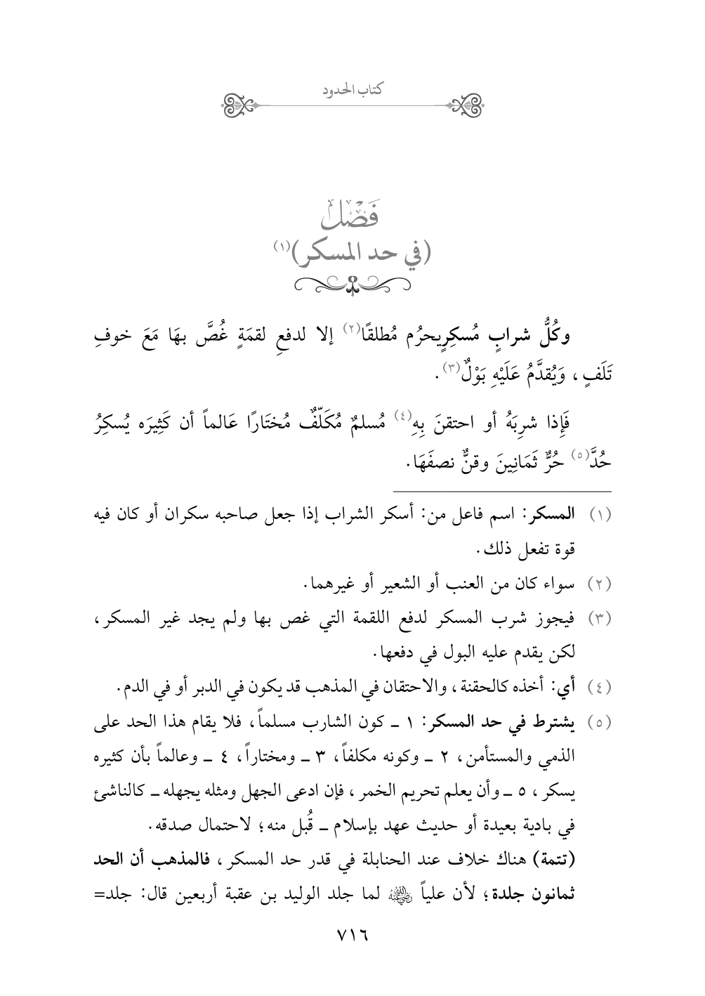 (تتمة) هناك خلاف عند الحنابلة في قدر حد المسكر، فالمذهب أن الحد ثمانون جلدة؛ لأن علياً رضي الله عنه لما جلد الوليد بن عقبة أربعين قال: جلد النبي صلى الله عليه وسلم أربعين، وجلد أبو بكر أربعين، وجلد عمر ثمانين، وكلٌّ سنة، وهذا أحب إليّ، رواه مسلم. والرواية الثانية في المذهب: قال في الإنصاف: (وعنه: أربعون، اختاره أبو بكر، والمصنف، والشارح، وجزم به في العمدة، والتسهيل. وأطلقهما في الهداية، والمذهب، والمستوعب، والهادي، والكافي، والمذهب الأحمد. وجوز الشيخ تقي الدين - رحمه الله - الثمانين للمصلحة وقال: هي الرواية الثانية. فالزيادة عنده على الأربعين إلى الثمانين: ليست واجبة على الإطلاق، ولا محرمة على الإطلاق. بل يرجع فيها إلى اجتهاد الإمام. كما جوزنا له الاجتهاد في صفة الضرب فيه: بالجريد، والنعال، وأطراف الثياب. بخلاف بقية الحدود. انتهى. قال الزركشي قلت: وهذا القول هو الذي يقوم عليه الدليل).