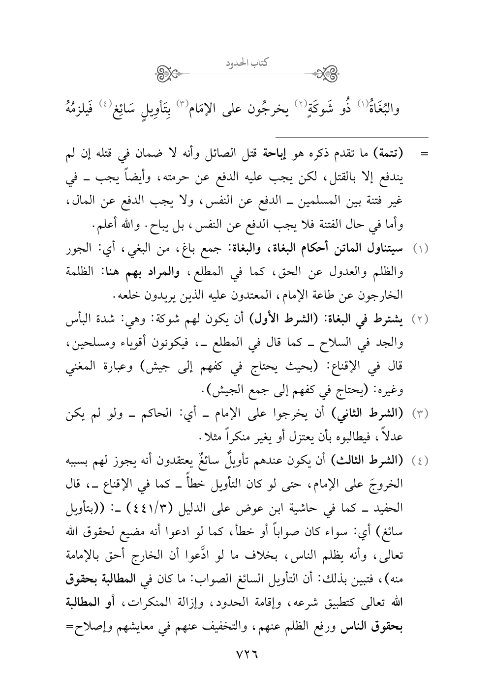 (¬٤) (الشرط الثالث) أن يكون عندهم تأويلٌ سائغٌ يعتقدون أنه يجوزُ لهم بسببه الخروجَ على الإمام، حتى لو كان التأويل خطأً - كما في الإقناع -، قال الحفيد - كما في حاشية ابن عوض على الدليل (٣/ ٤٤١) -: ((بتأويل سائغ) أي: سواء كان صواباً أو خطأ، كما لو ادعوا أنه مضيع لحقوق الله تعالى، وأنه يظلم الناس، بخلاف ما لو ادَّعوا أن الخارج أحق بالإمامة منه)، فتبين بذلك: أن التأويل السائغ الصواب: ما كان في المطالبة بحقوق الله تعالى كتطبيق شرعه، وإقامة الحدود، وإزالة المنكرات، أو المطالبة بحقوق الناس ورفع الظلم عنهم، والتخفيف عنهم في معايشهم وإصلاح مكان حياتهم ونحو ذلك، وأما ما خرج عن هذين كما لو طالبوا بتنصيب غيره لكونه أكفأ منه مثلاً، أو ليعطيهم من المال ما يزيد على حوائجهم زيادة فيها إسراف من غير مقابل ونحو ذلك، فهذه تأويلات سائغة خاطئة، والله أعلم. (بحث)