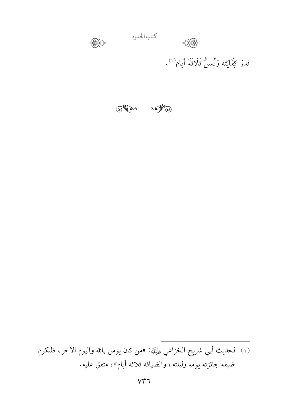 (¬١) لحديث أبي شريح الخزاعي رضي الله عنه: «من كان يؤمن بالله واليوم الآخر، فليكرم ضيفه جائزته يومه وليلته، والضيافة ثلاثة أيام»، متفق عليه.