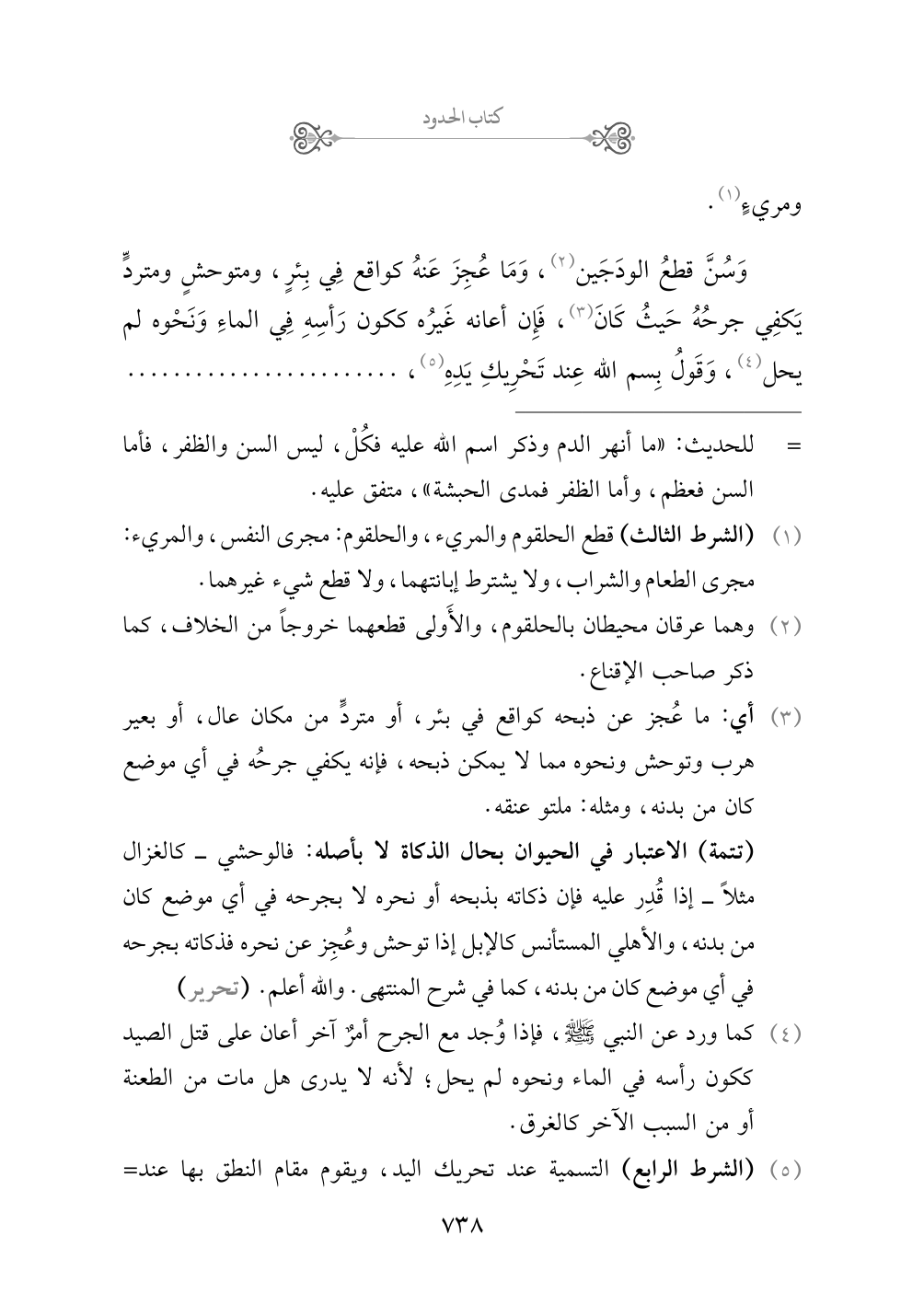 (¬٢) وهما عرقان محيطان بالحلقوم، والأَولى قطعهما خروجاً من الخلاف، كما ذكر صاحب الإقناع.