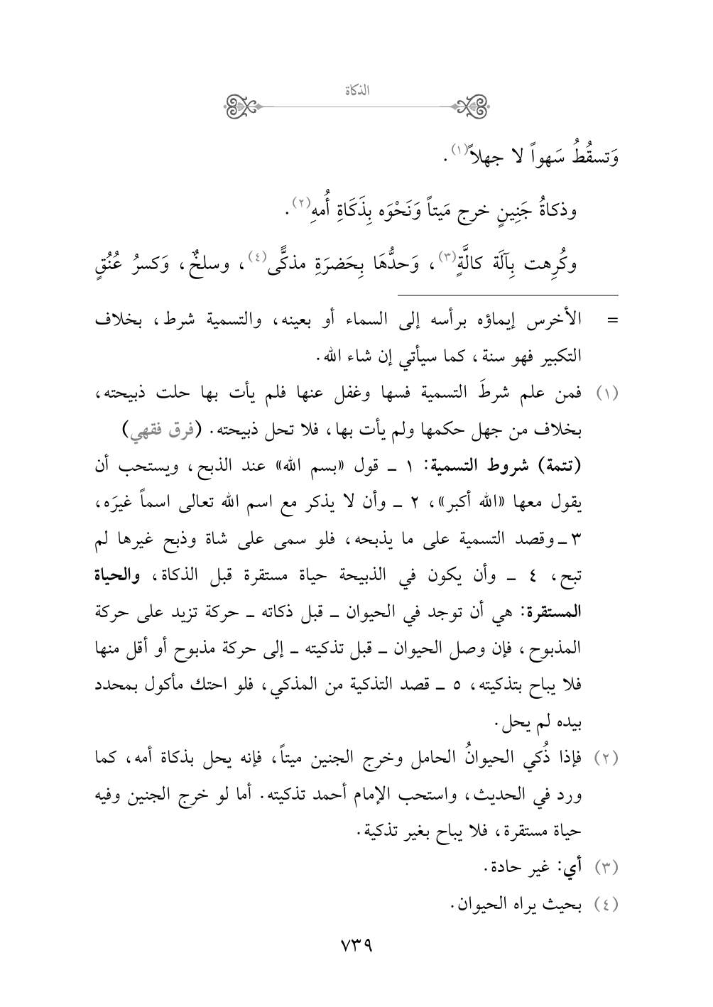 (تتمة) شروط التسمية: ١ - قول «بسم الله» عند الذبح، ويستحب أن يقول معها «الله أكبر»، ٢ - وأن لا يذكر مع اسم الله تعالى اسماً غيرَه، ٣ - وقصد التسمية على ما يذبحه، فلو سمى على شاة وذبح غيرها لم تبح، ٤ - وأن يكون في الذبيحة حياة مستقرة قبل الذكاة، والحياة المستقرة: هي أن توجد في الحيوان - قبل ذكاته - حركة تزيد على حركة المذبوح، فإن وصل الحيوان - قبل تذكيته - إلى حركة مذبوح أو أقل منها فلا يباح بتذكيته، ٥ - قصد التذكية من المذكي، فلو احتك مأكول بمحدد بيده لم يحل.