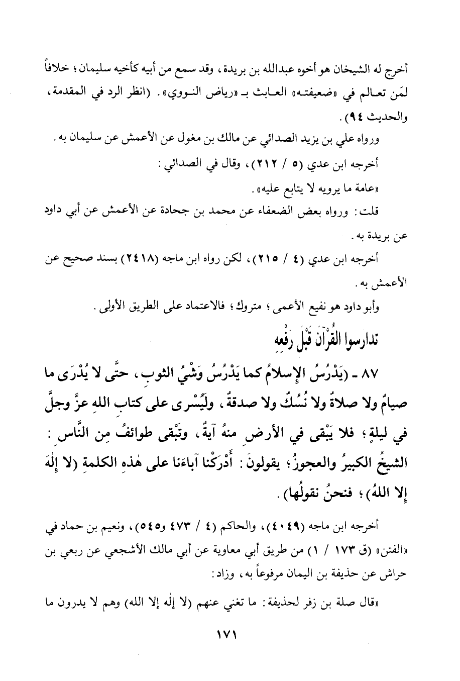 87 - " يدرس الإسلام كما يدرس وشي الثوب حتى لا يدرى ما صيام ولا صلاة ولا نسك