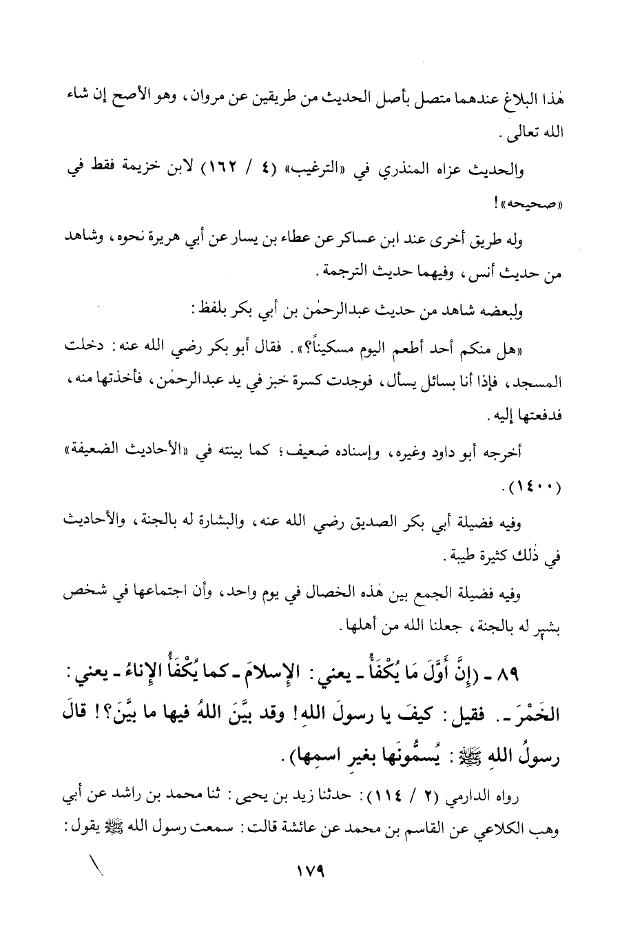89 - " إن أول ما يكفئ - يعني الإسلام - كما يكفأ الإناء - يعني الخمر -، فقيل: