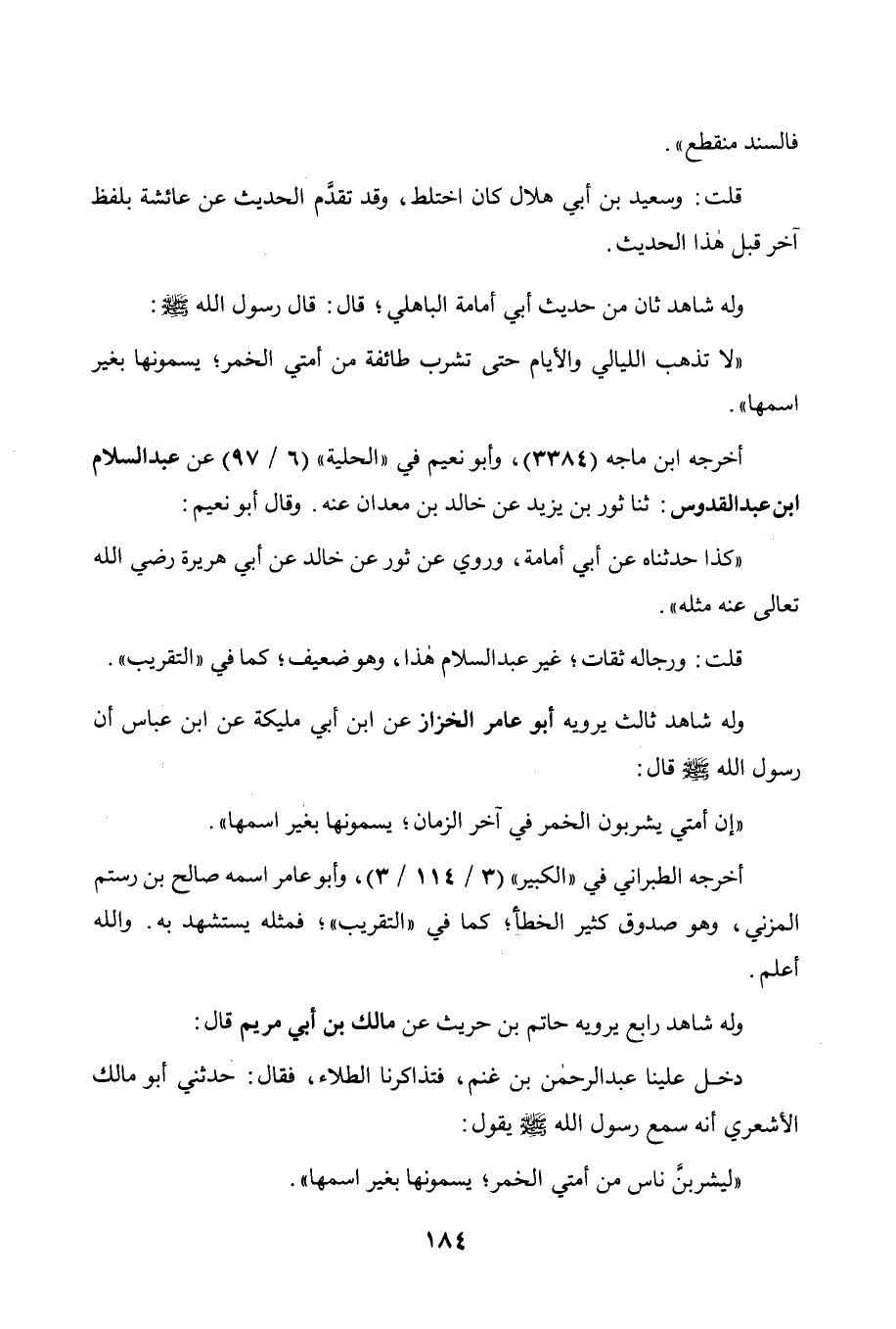 " لا تذهب الليالي والأيام، حتى تشرب طائفة من أمتي الخمر، يسمونها بغير